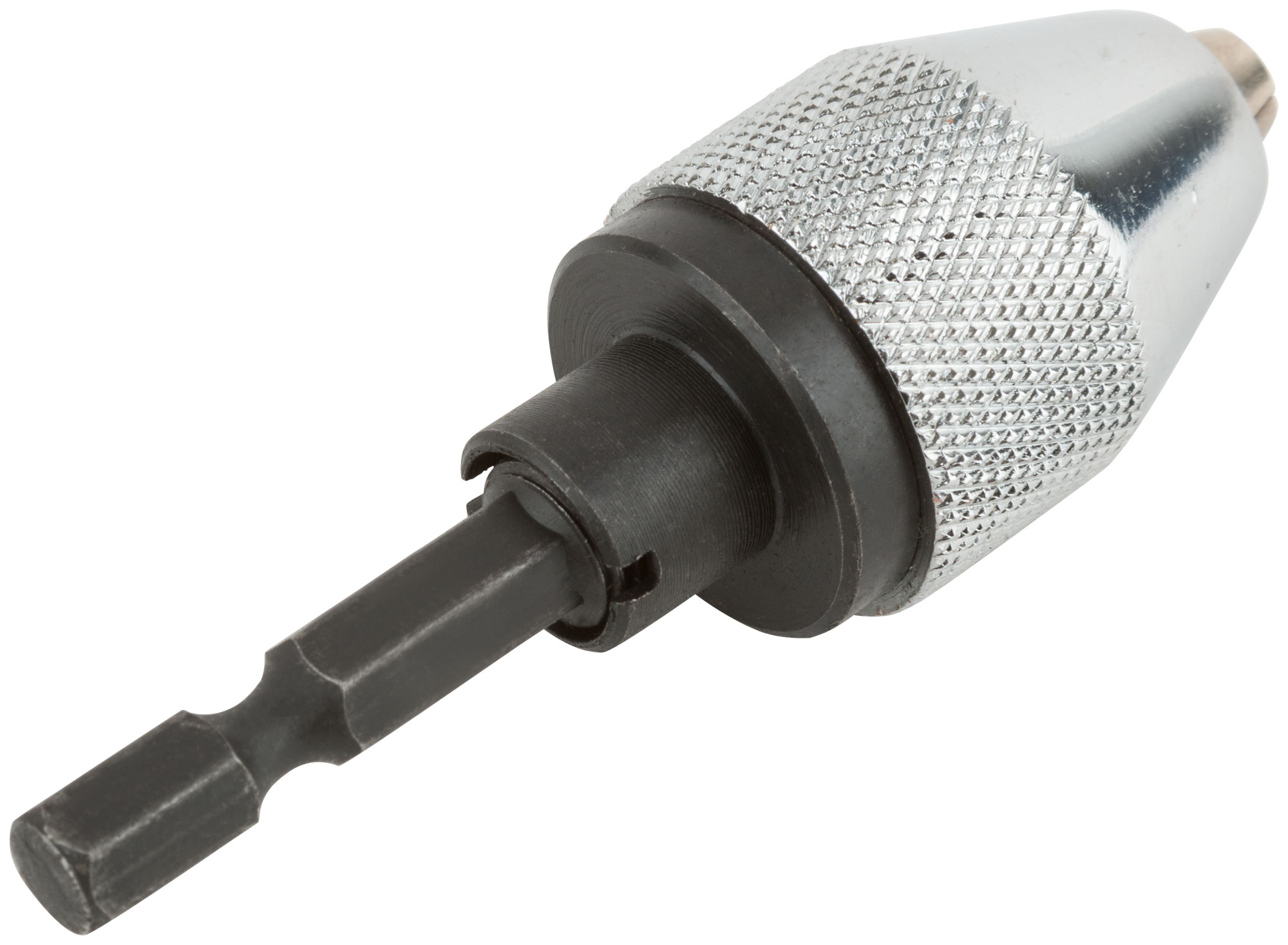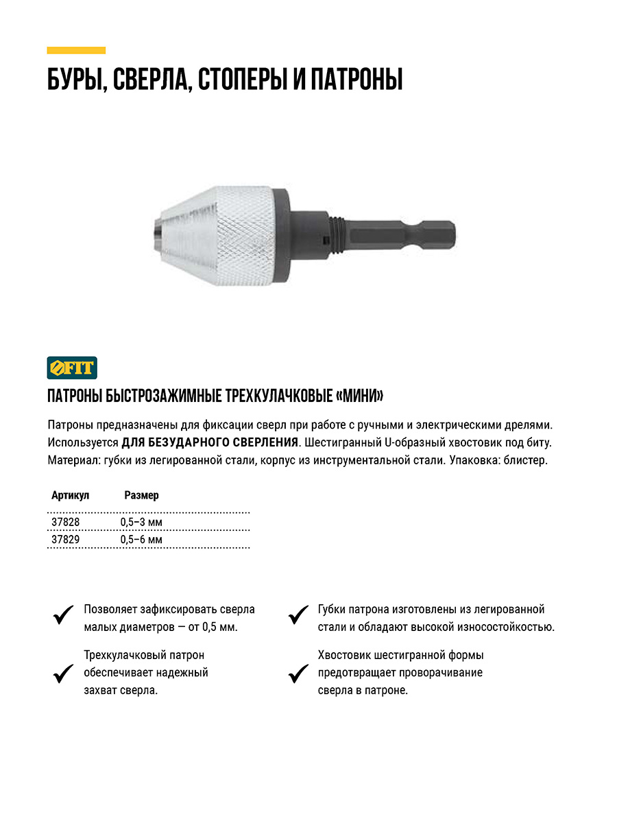 Мини. Трехкулачковый. Для ручных и электрических дрелей. Для безударного сверления. Шестигранный U-образный хвостовик под биту.Материал: губки из легированной стали, корпус из инструментальной стали. Упаковка: блистер.