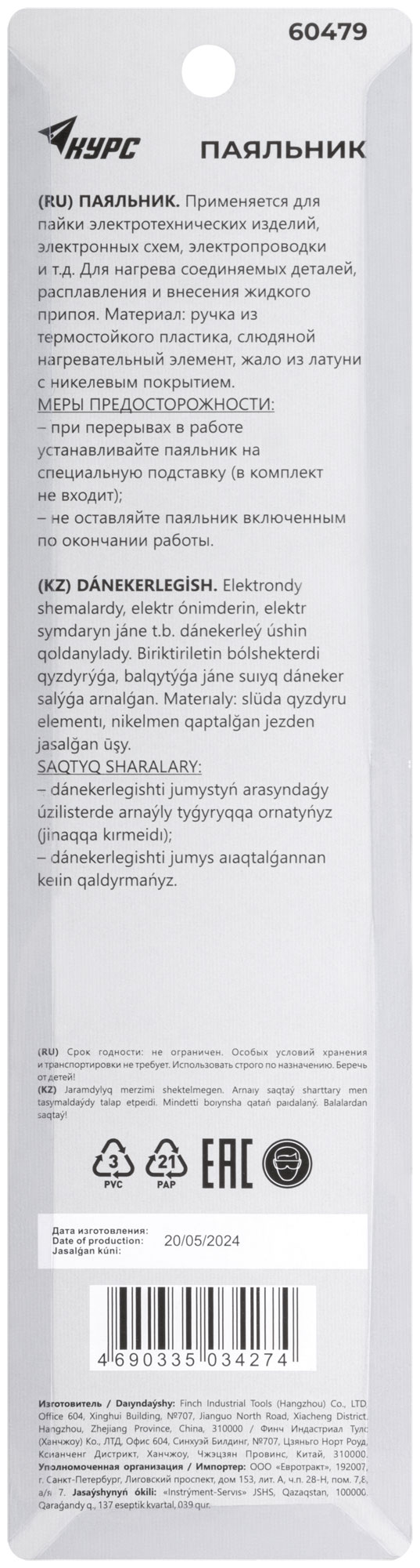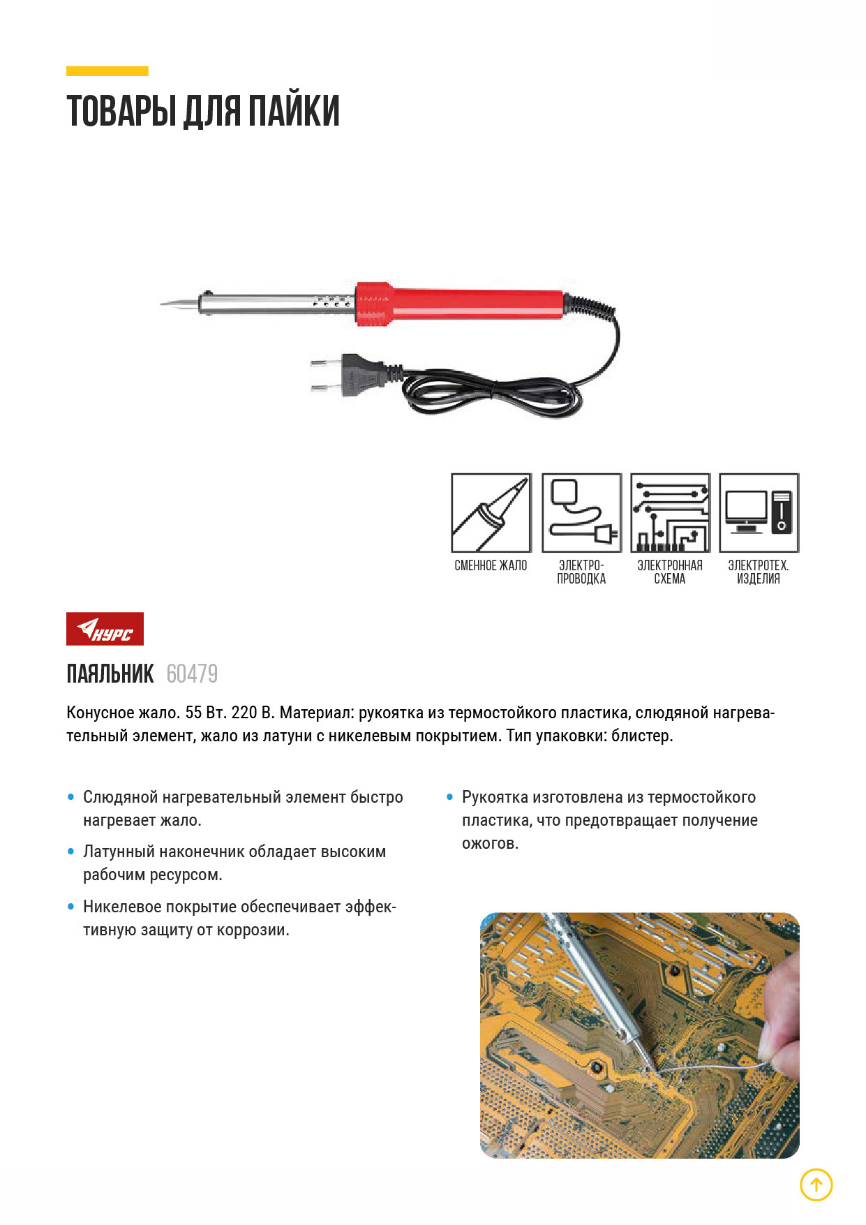 220 В. Материал: ручка из термостойкого пластика, слюдяной нагревательный элемент, жало из латуни с никелевым покрытием. Упаковка: блистер.