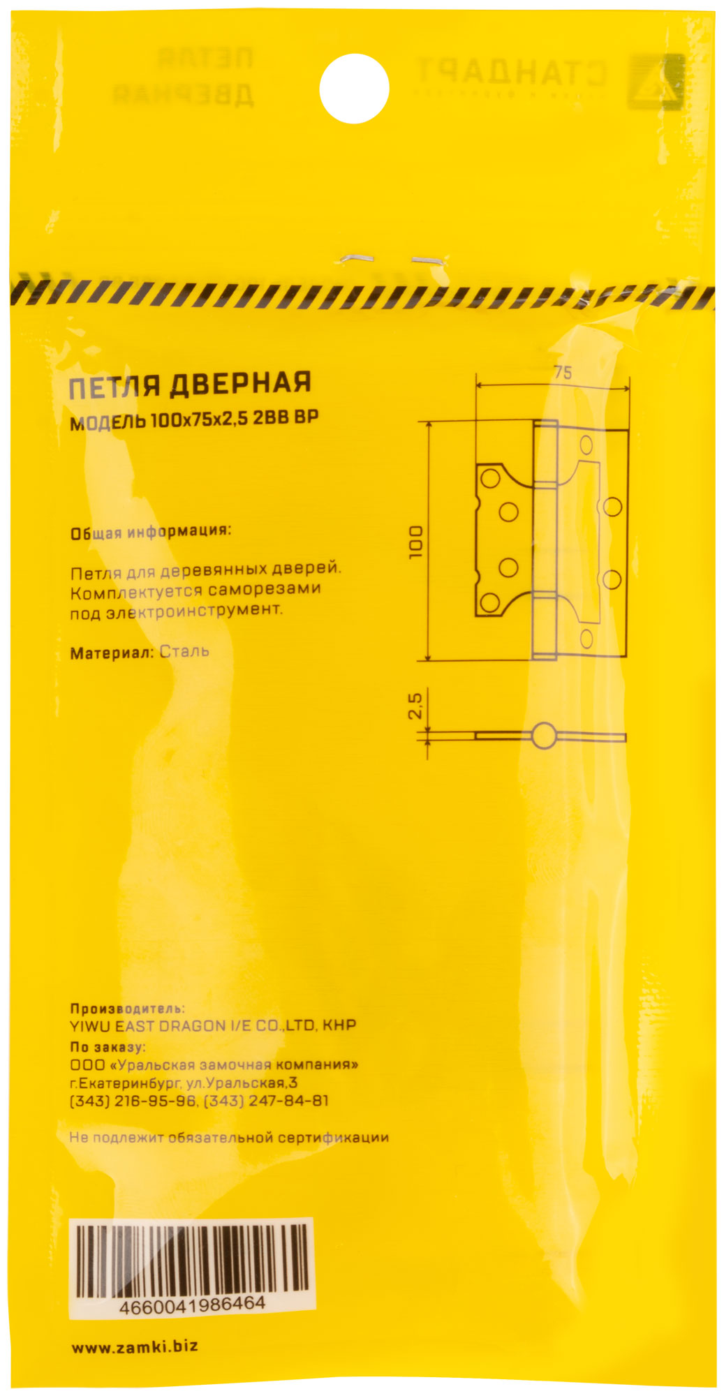 Петля дверная универсальная накладная, без врезки. 2 противоскрипных кольца, плоский колпачок. Предназначена для установки на левые и правые двери. Материал: сталь, гальваническое покрытие. Упаковка: п/э пакет с подвесом.