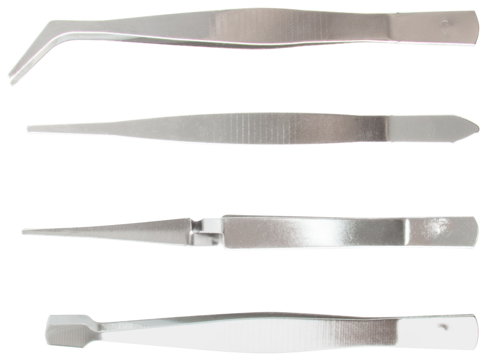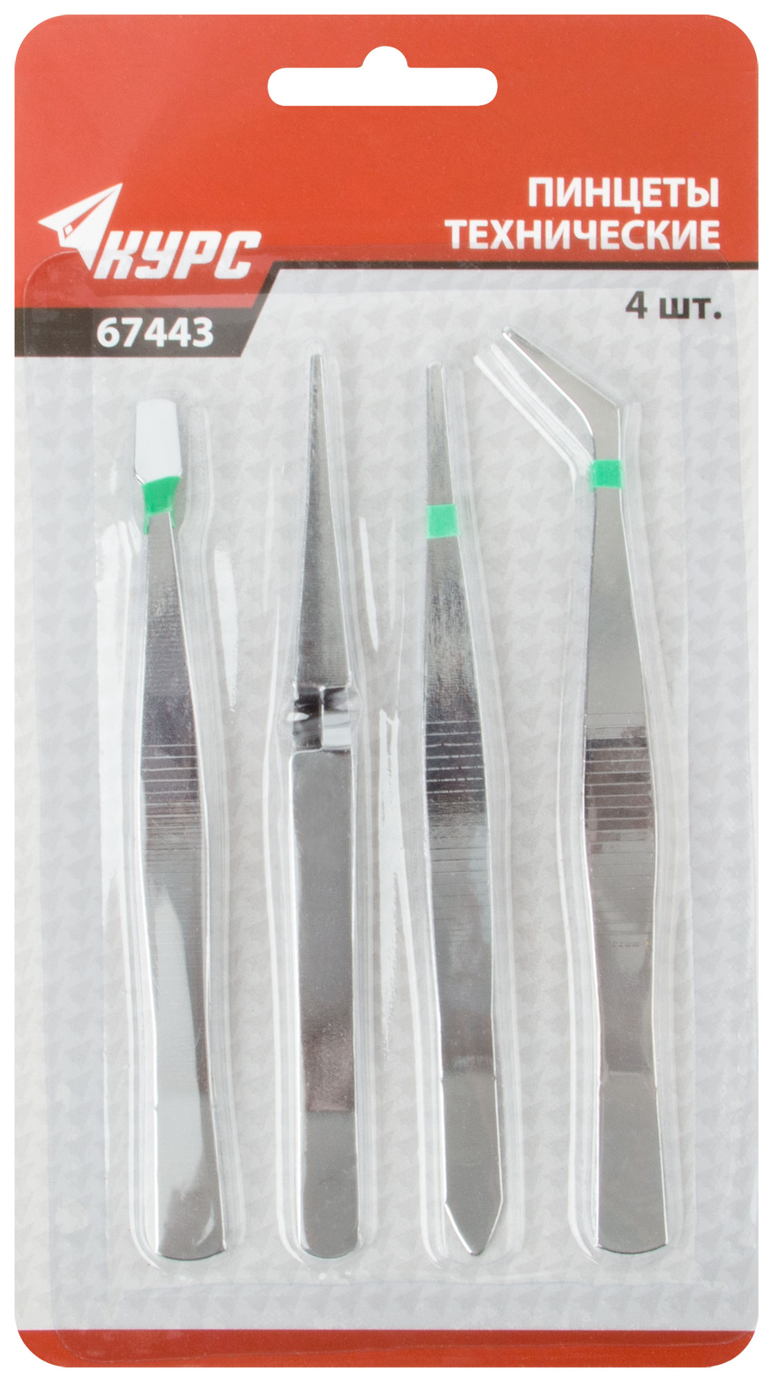 Набор. "Пинцет прямой". *Пинцет с захватом под углом 45 град . *Пинцет с изогнутым широким захватом. * Пинцет обратного действия. Материал: инструментальная сталь. Упаковка: блистер .