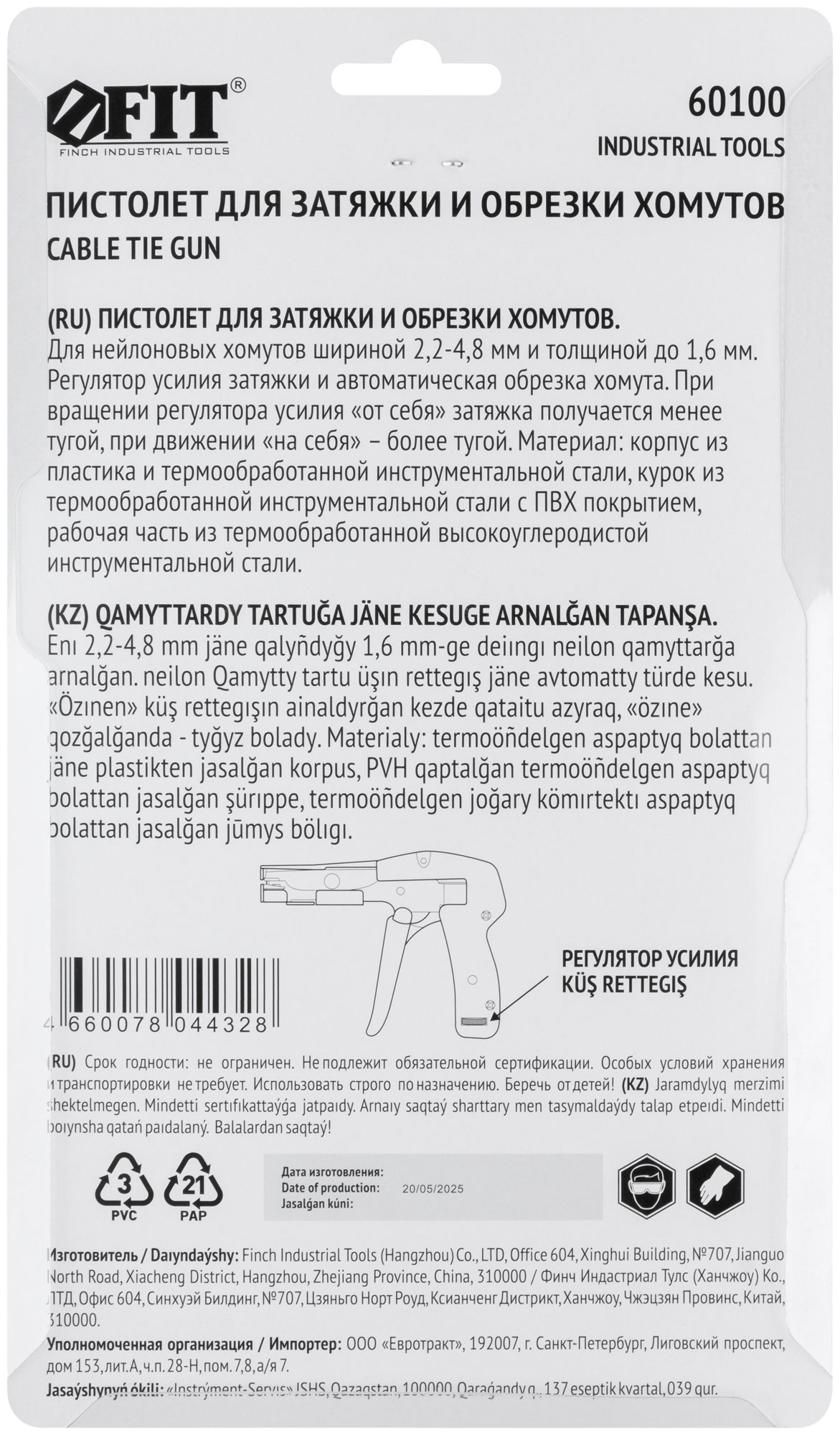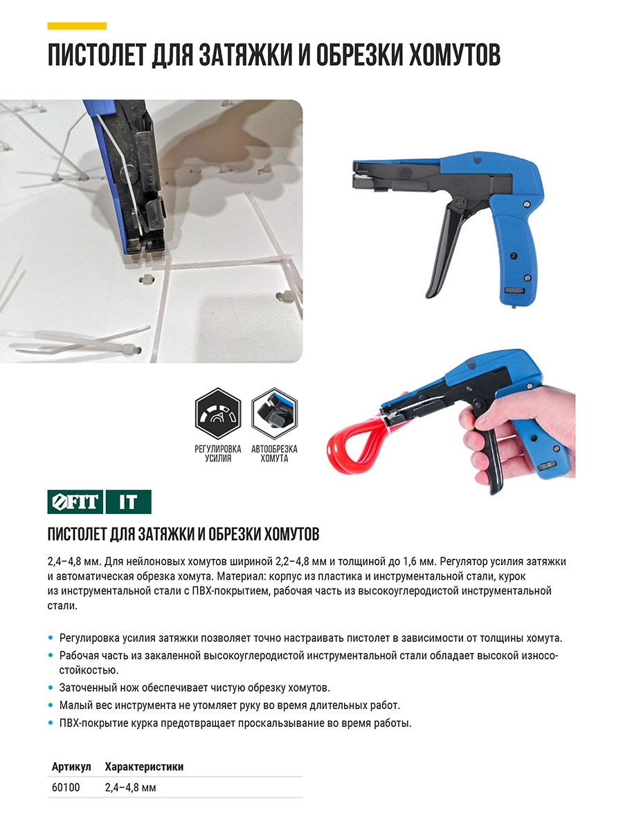 Для нейлоновых хомутов шириной 2,2-4,8 мм и толщиной до 1,6 мм. Регулятор усилия затяжки и автоматическая обрезка хомута. Материал: корпус из пластика и инструментальной стали, курок из инструментальной стали с ПВХ покрытием, рабочая часть из высокоуглеродистой инструментальной стали. Упаковка: блистер.