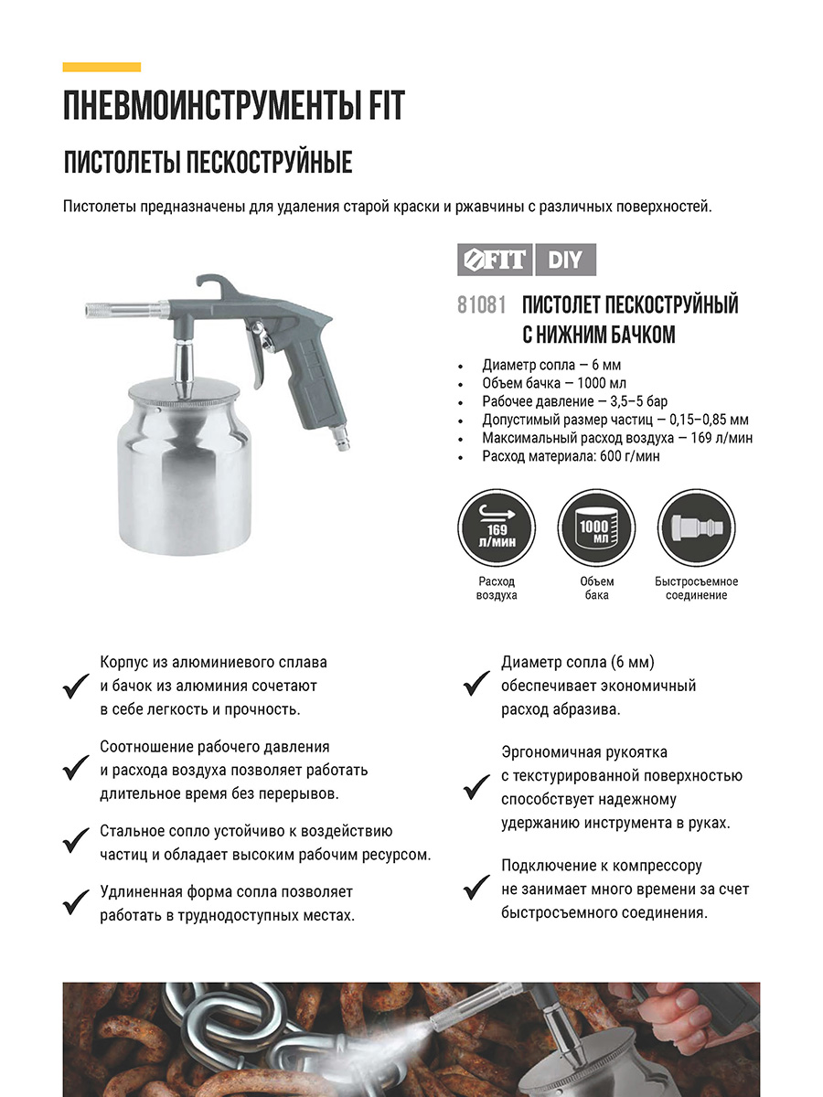 Для пневмокомпрессора. Соединение быстросъемное. Объем бака 1000 мл. Расход воздуха 169Kл / мин. Максимальное давление 8 бар, рабочее давление 3,5-5 бар. Для удаления старой краски и ржавчины с деталей и поверхностей. Материал: алюминиевый нижний бачок, корпус из алюминия с порошковым покрытием. Упаковка: картонная коробка.