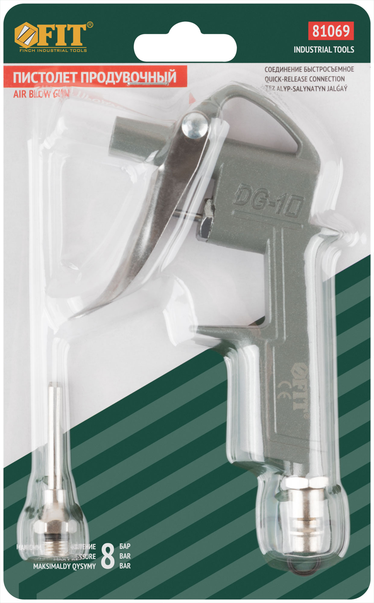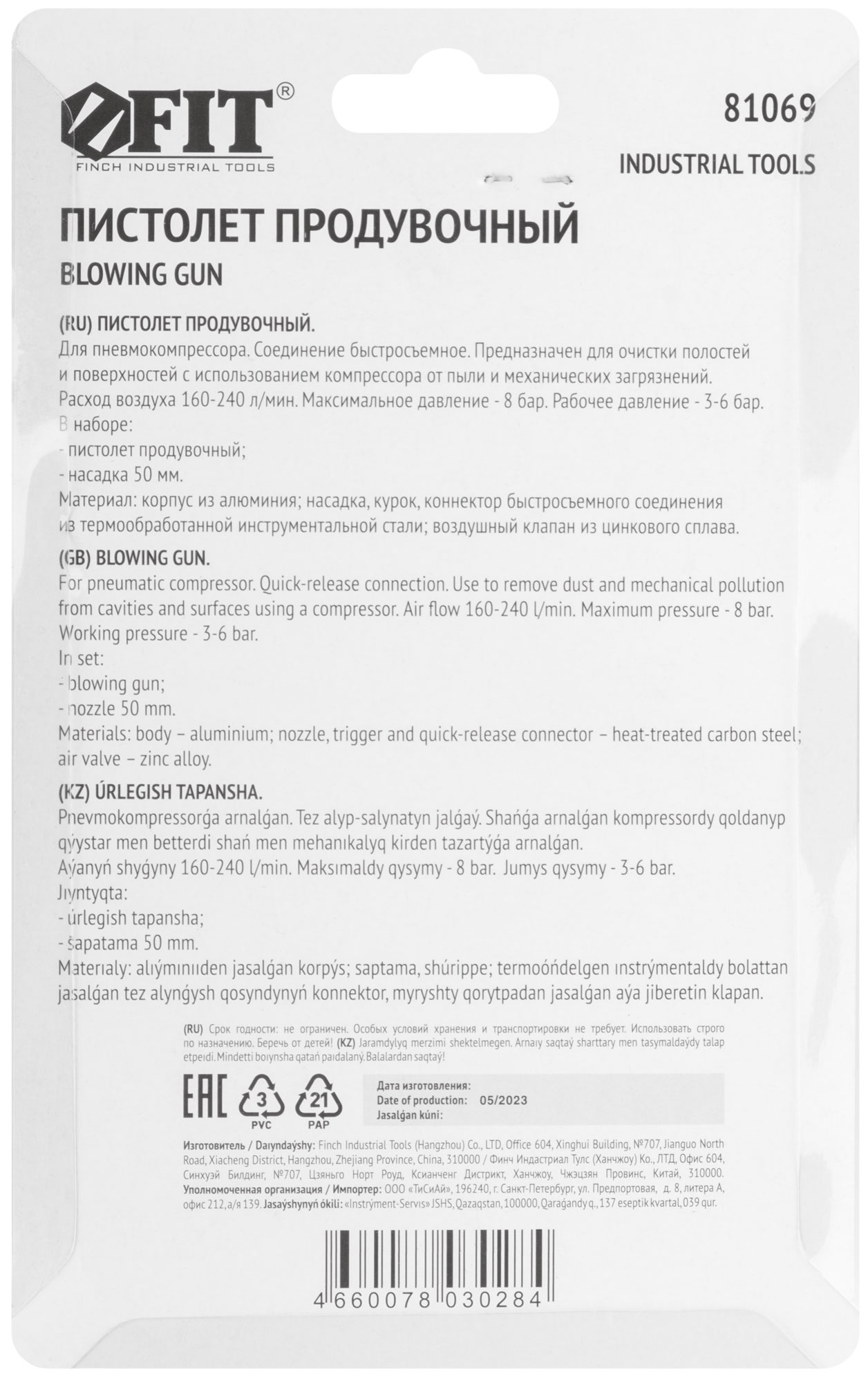 Для пневмокомпрессора. Соединение быстросъемное. Используется для очистки полостей и поверхностей от пыли и механических загрязнений. Максимальное давление - 8 бар. Рабочее давление 3-6 бар. КОМПЛЕКТАЦИЯ: пистолет продувочный, насадка 50 мм. Материал: корпус из алюминия; насадка, курок, коннектор быстросъемного соединения из инструментальной стали; воздушный клапан из цинкового сплава. Упаковка: блистер.