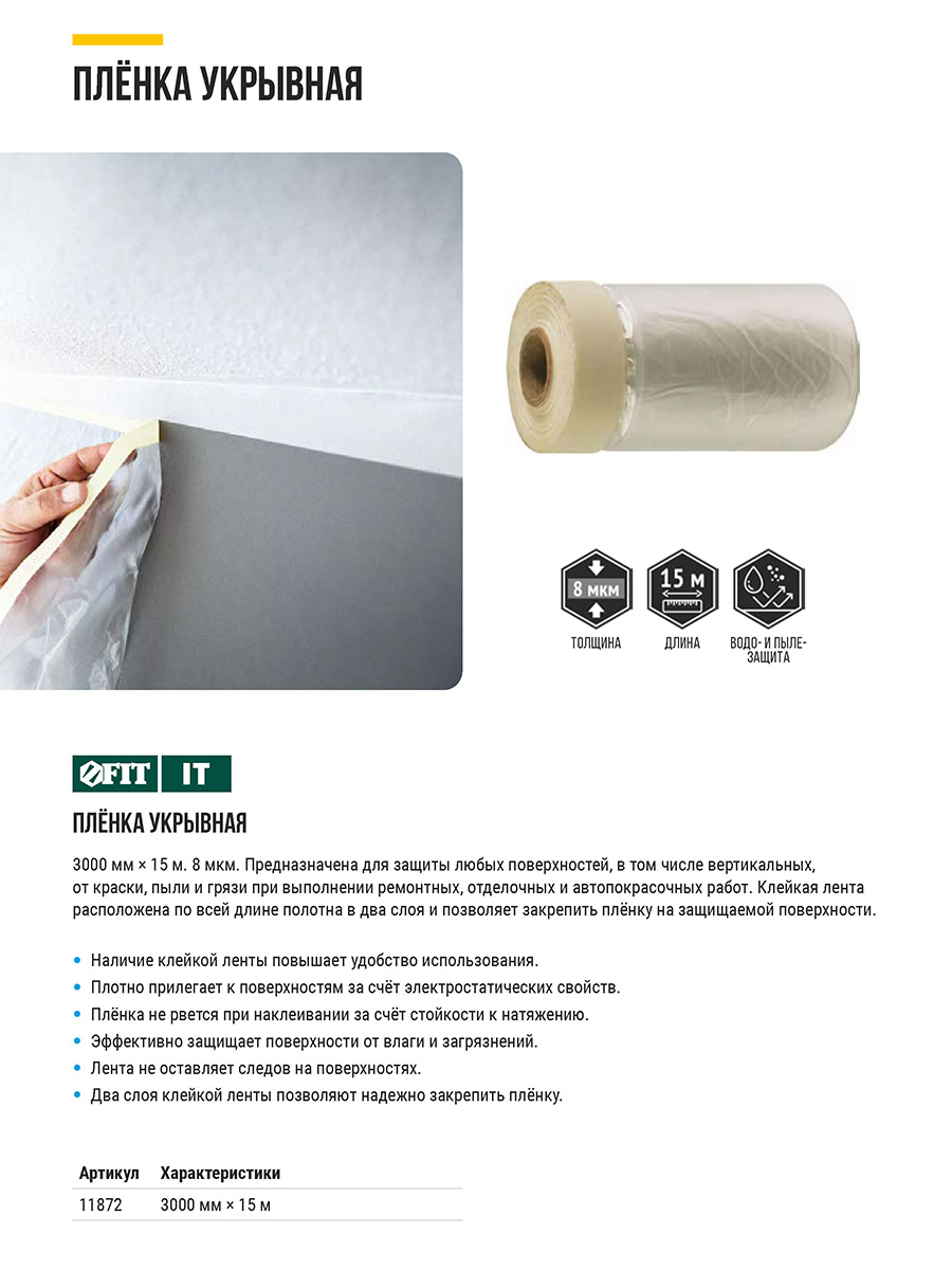 8 мкм. Для защиты от краски, пыли, грязи при проведении покрасочных, ремонтных и отделочных работ. Клейкая лента, расположенная по всей длине полотна (у 11867-11872 в два слоя), позволяет закрепить пленку на защищаемой поверхности. Материал: полиэтилен, бумага, клеевой слой.