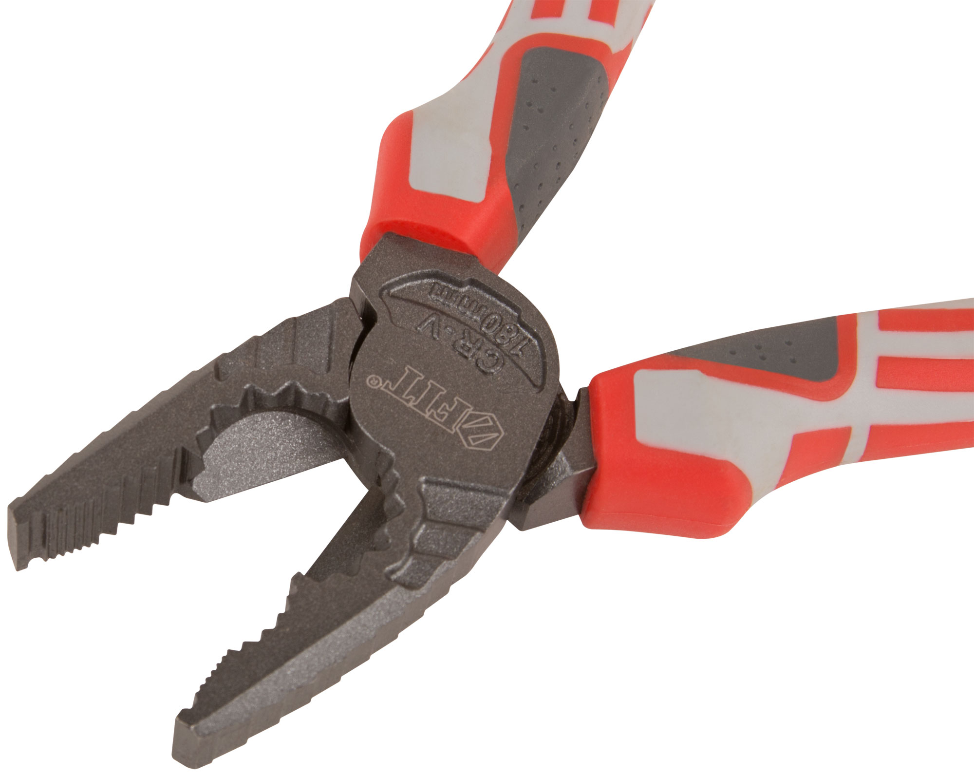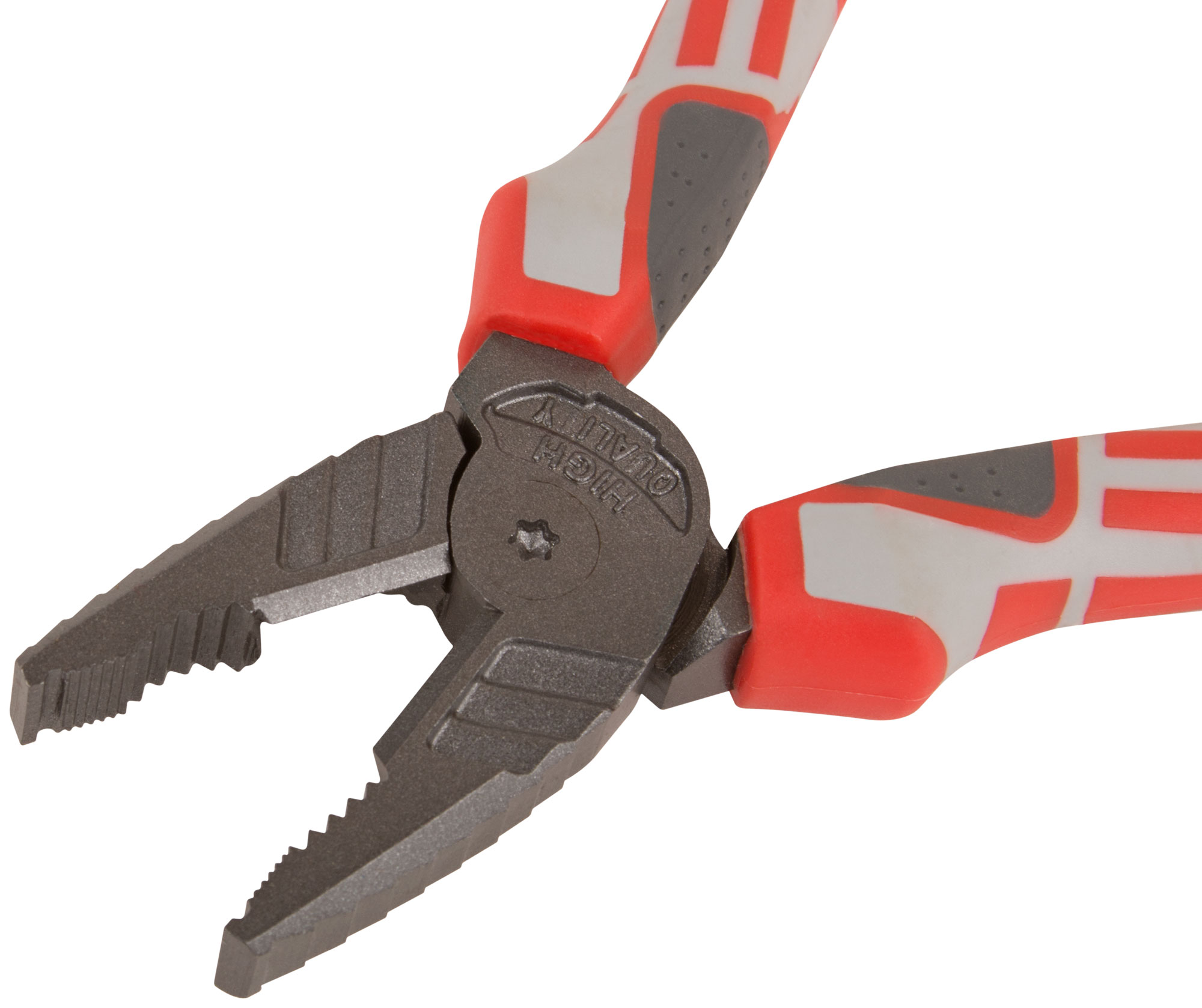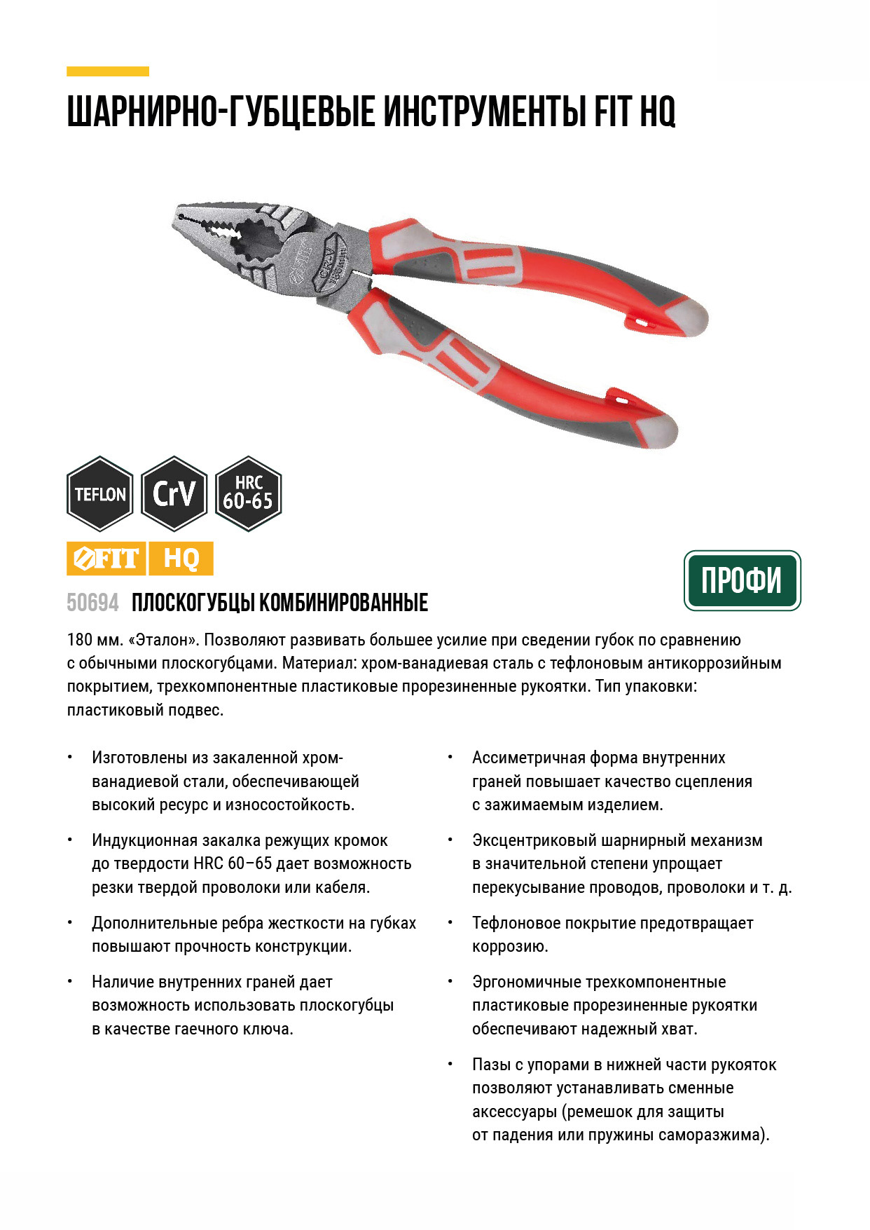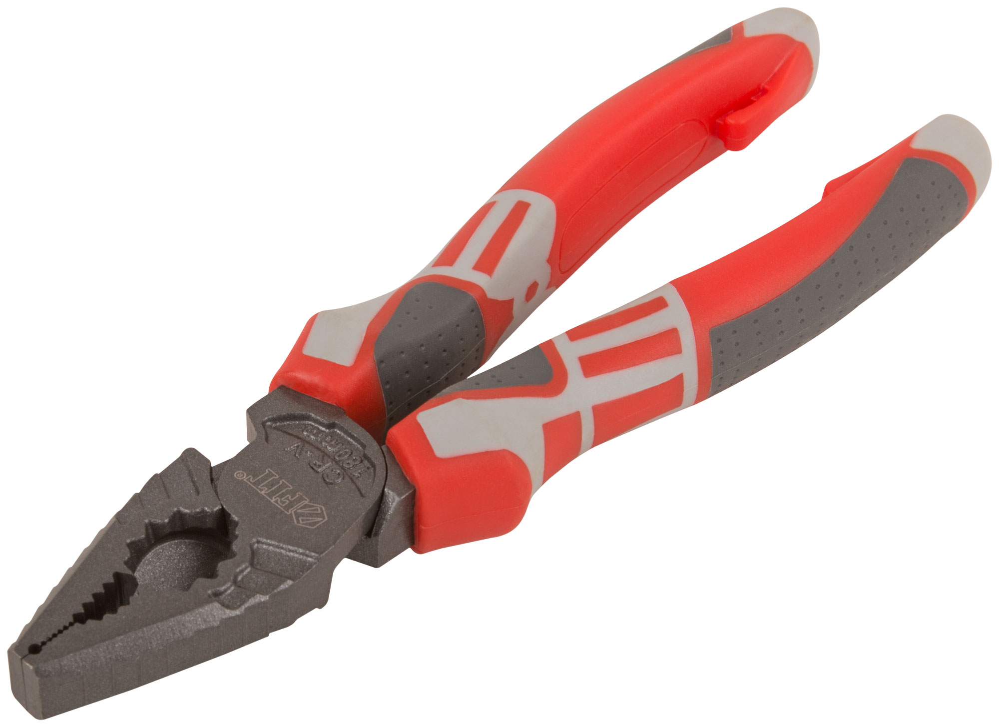 Профи. Дополнительные ребра жесткости на губках для упрочнения конструкции. Материал: хром-ванадиевая сталь с тефлоновым антикоррозийным покрытием, трехкомпонентные пластиковые прорезиненные ручки. Упаковка: пластиковый подвес.ПЛОСКОГУБЦЫ КОМБИНИРОВАННЫЕ. Позволяют развивать большее усилие при сведении губок по сравнению с обычными плоскогубцами. Специальные внутренние грани для откручивания или закручивания болтов и гаек.