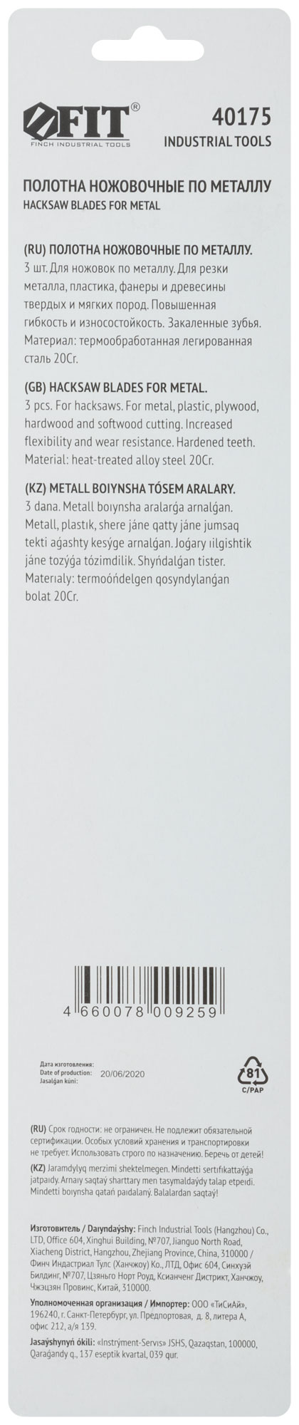 Для ножовки по металлу. Гибкое, калёный зуб. Материал: легированная 20 Cr сталь.
