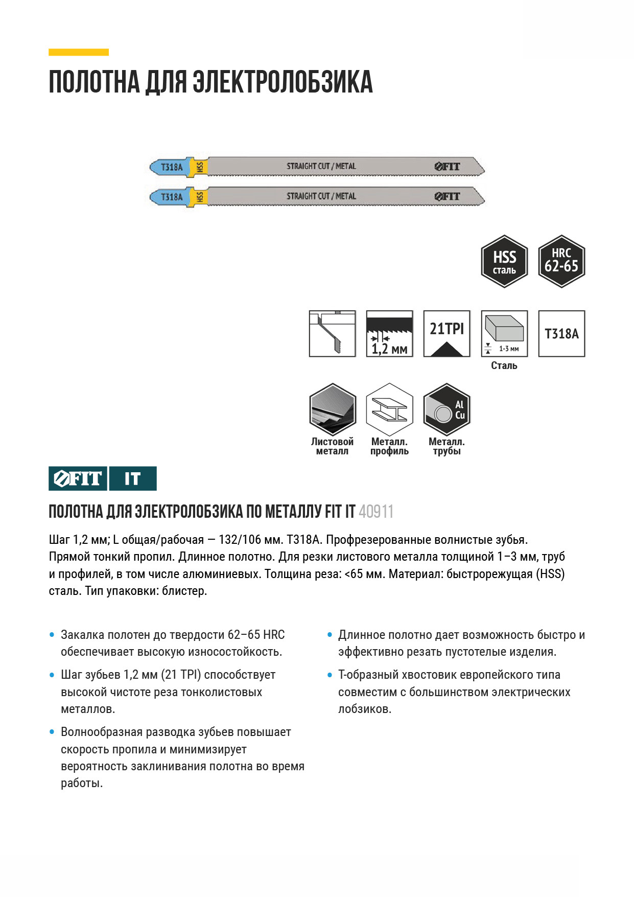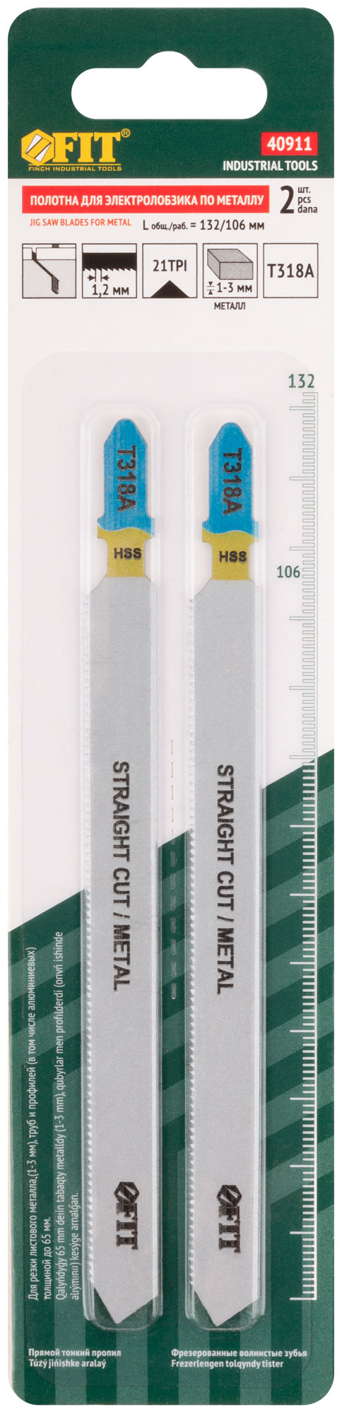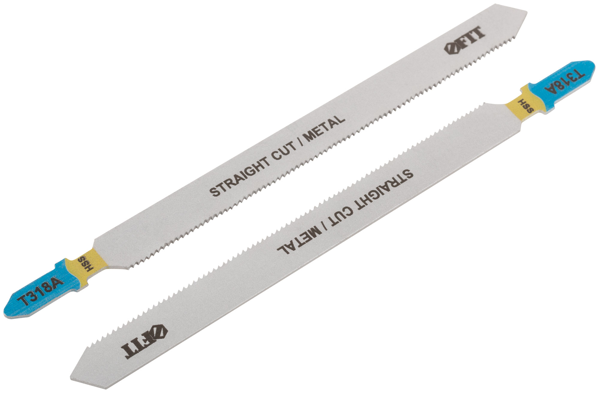 T318A. Профрезерованные волнистые зубья. Прямой тонкий пропил. Длинное полотно. Для резки листового металла толщиной 1-3 мм, труб и профилей (в том числе алюминиевых). Толщина реза: <65 мм. Материал: быстрорежущая (HSS) сталь. Упаковка: блистер.