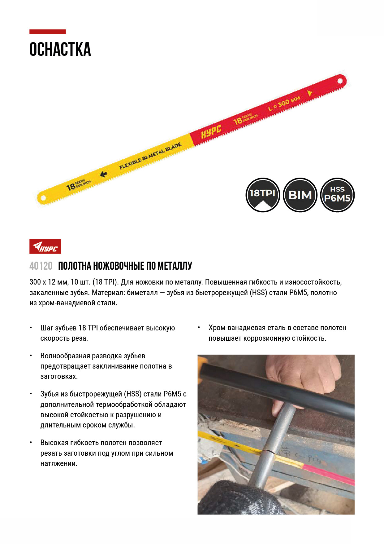 Профи. Для ножовки по металлу. Повышенная гибкость и износостойкость, закаленные зубья. Материал: биметалл - зубья из быстрорежущей (HSS) стали Р6М5, полотно из хром-ванадиевой стали.
