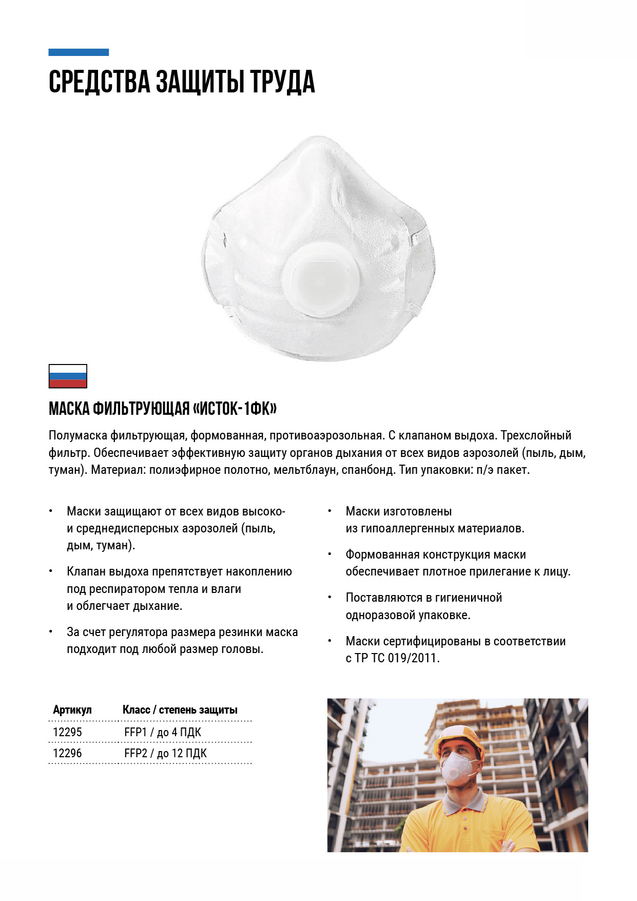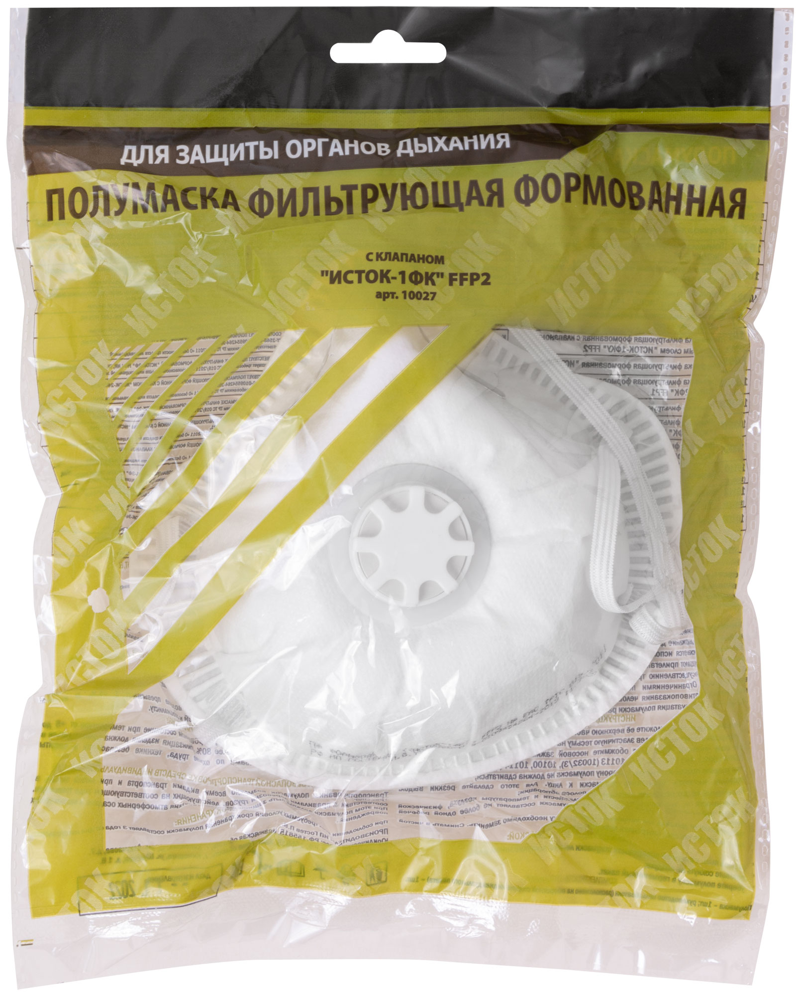 «ИСТОК-1ФК». Полумаска фильтрующая, формованая, противоаэрозольная. С клапаном выдоха. Трехслойный фильтр. Обеспечивает эффективную защиту органов дыхания от всех видов аэрозолей (пыль, дым, туман). Клапан выдоха препятствует накоплению под респиратором тепла и влаги, облегчает дыхание. Материал: полиэфирное полотно, мельтблаун, спанбонд. Упаковка: п/э пакет.