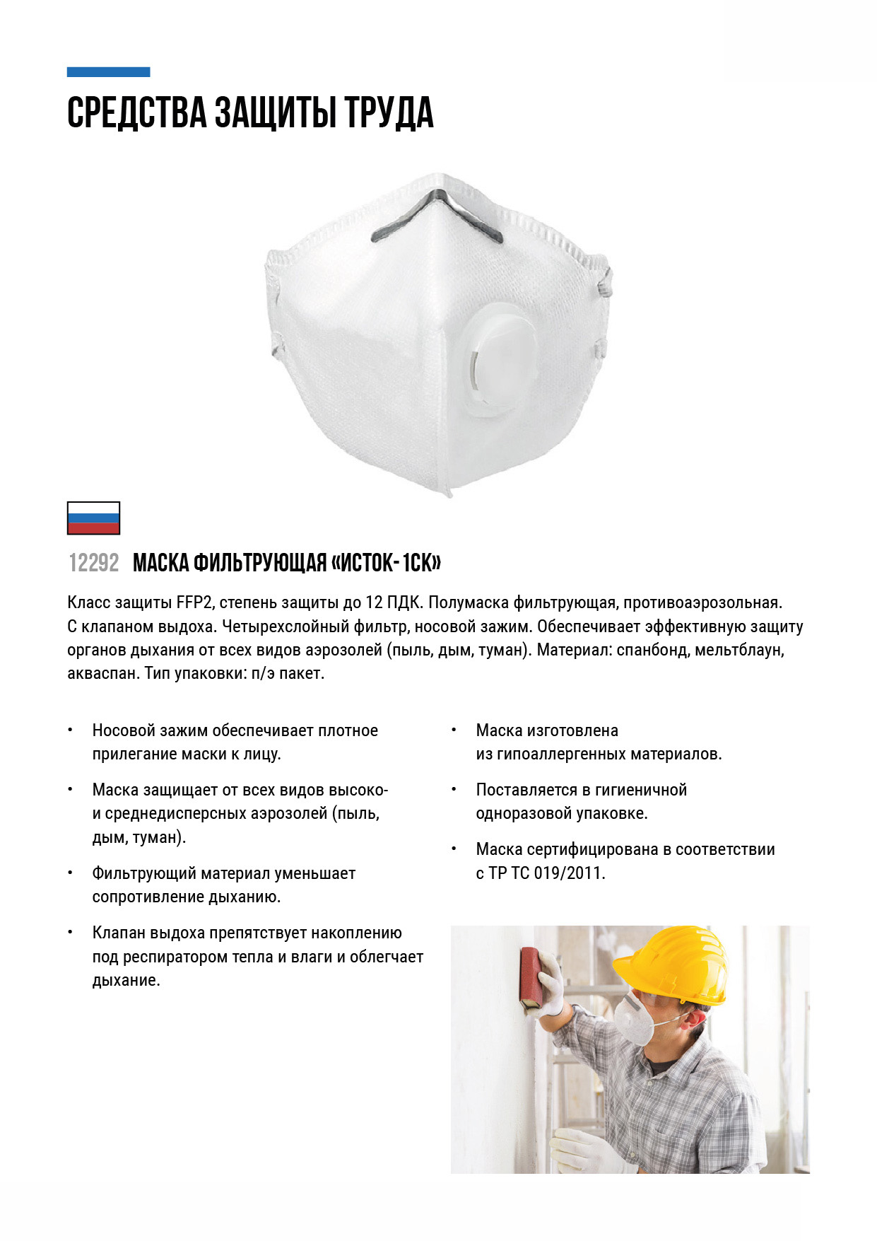 «ИСТОК-1СК». Полумаска фильтрующая,противоаэрозольная. С клапаном выдоха. Четырехслойный фильтр, носовой зажим. Обеспечивает эффективную защиту органов дыхания от всех видов аэрозолей (пыль, дым, туман). Клапан выдох препятствует накоплению под респиратором тепла и влаги, облегчает дыхание. Материал: спанбонд, мельтблаун, акваспан. Упаковка: п/э пакет.