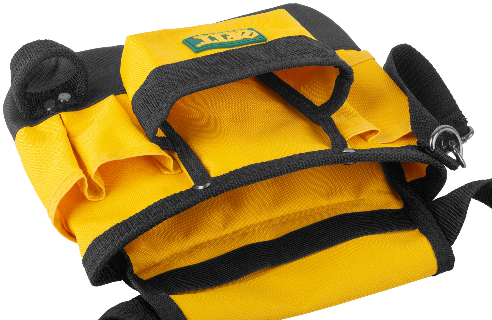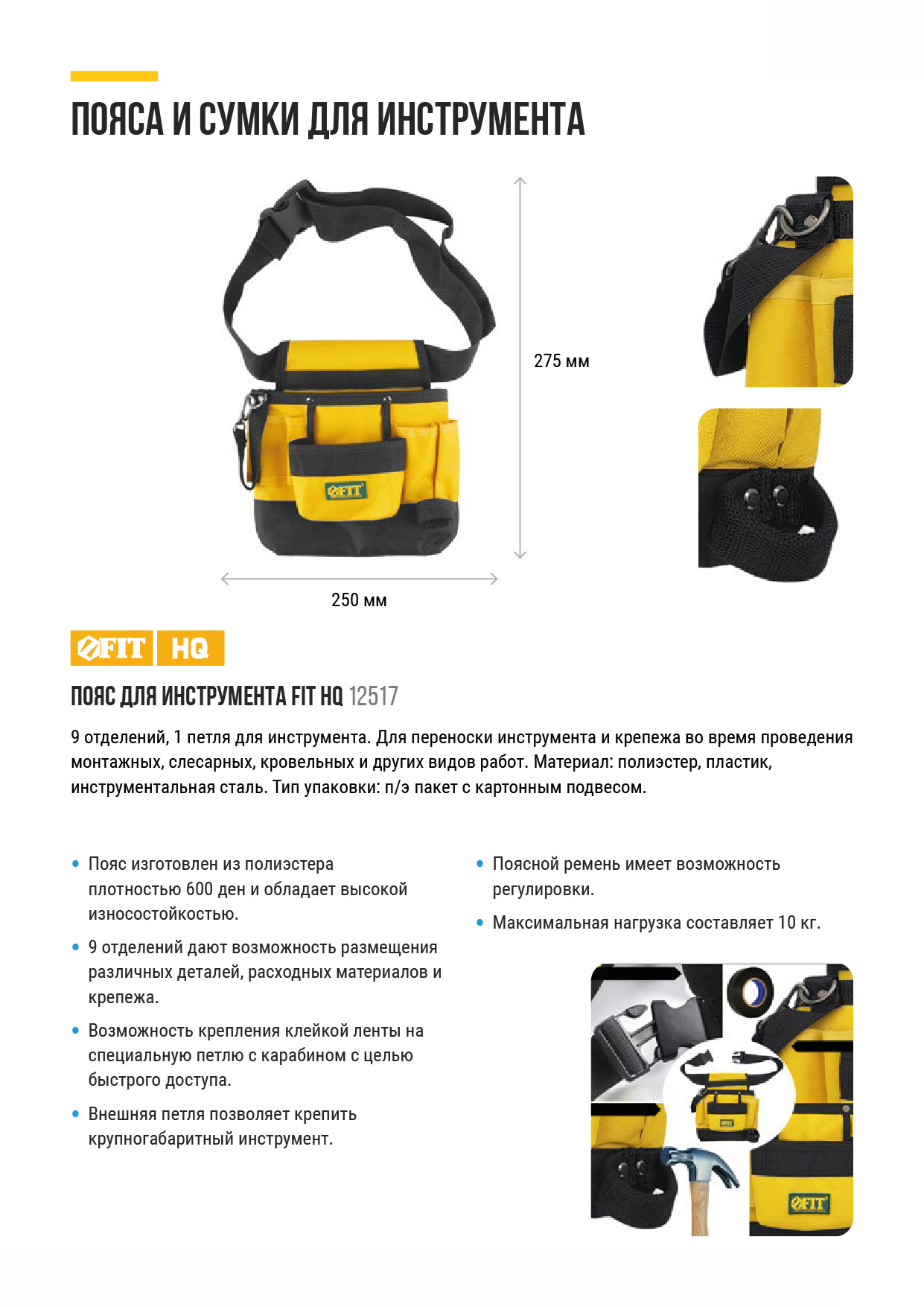 9 отделений, 1 петля для инструмента. Для переноски инструмента и крепежа во время проведения монтажных, слесарных, кровельных и других видов работ. Материал: полиэстер, пластик, инструментальная сталь. Упаковка: П/Э пакет с картонным подвесом.