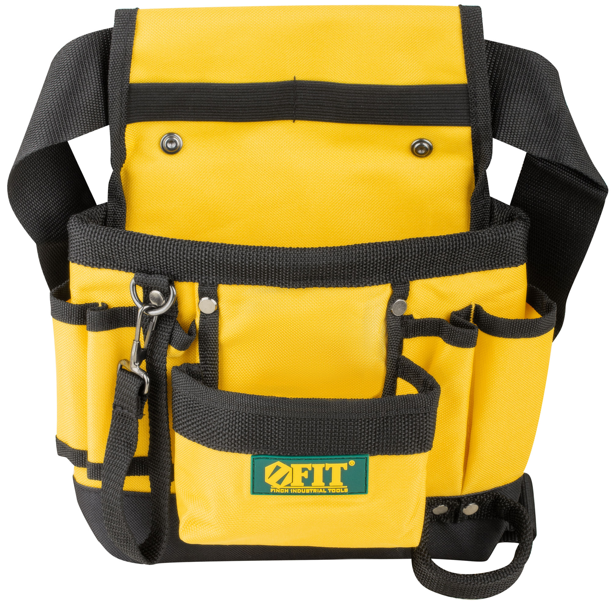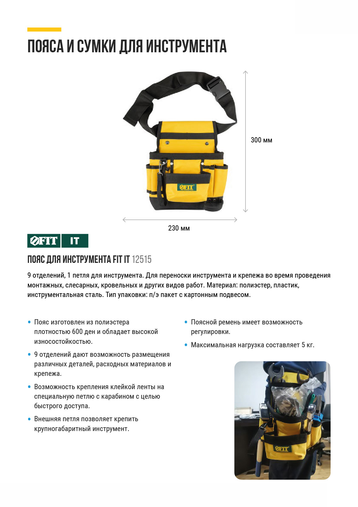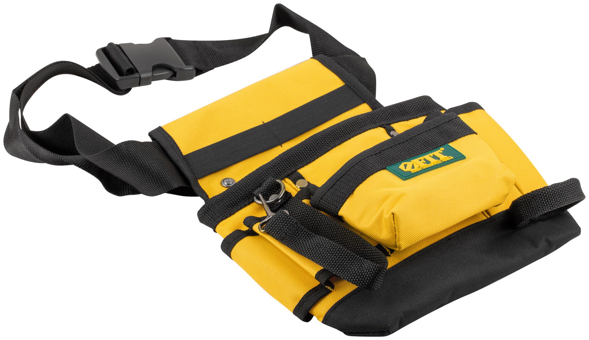 9 отделений, 1 петля для инструмента, 1 петля для клейкой ленты. Для переноски инструмента и крепежа во время проведения монтажных, слесарных, кровельных и других видов работ. Материал: полиэстер, пластик, инструментальная сталь. Упаковка: П/Э пакет с картонным подвесом.