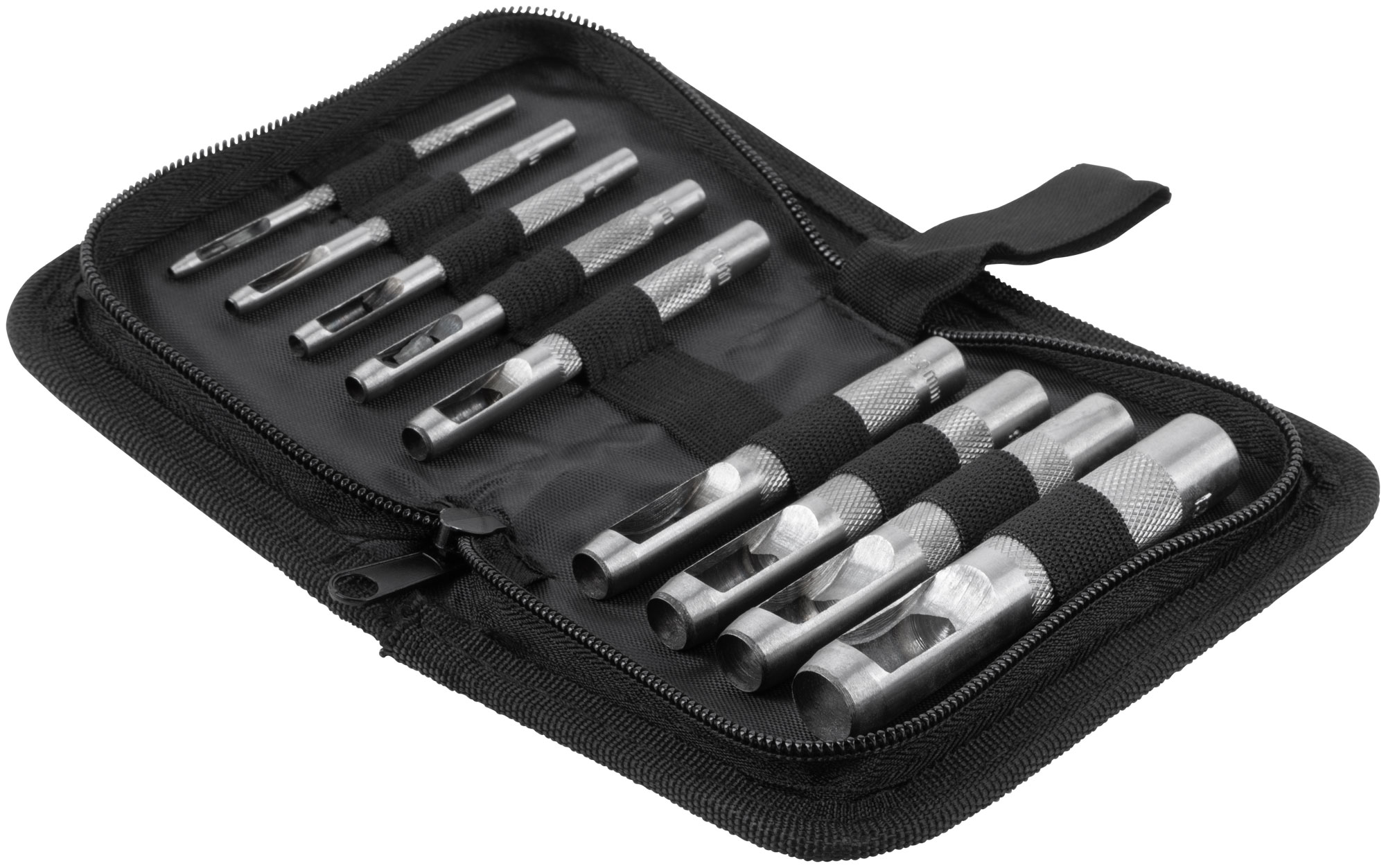 Для пробивания круглых отверстий в коже, резине и других мягких листовых материалах с помощью ударов киянкой или молотком по тыльной сторонепробойника. Материал: инструментальная сталь. Упаковка: нейлоновый чехол в картонной коробке.