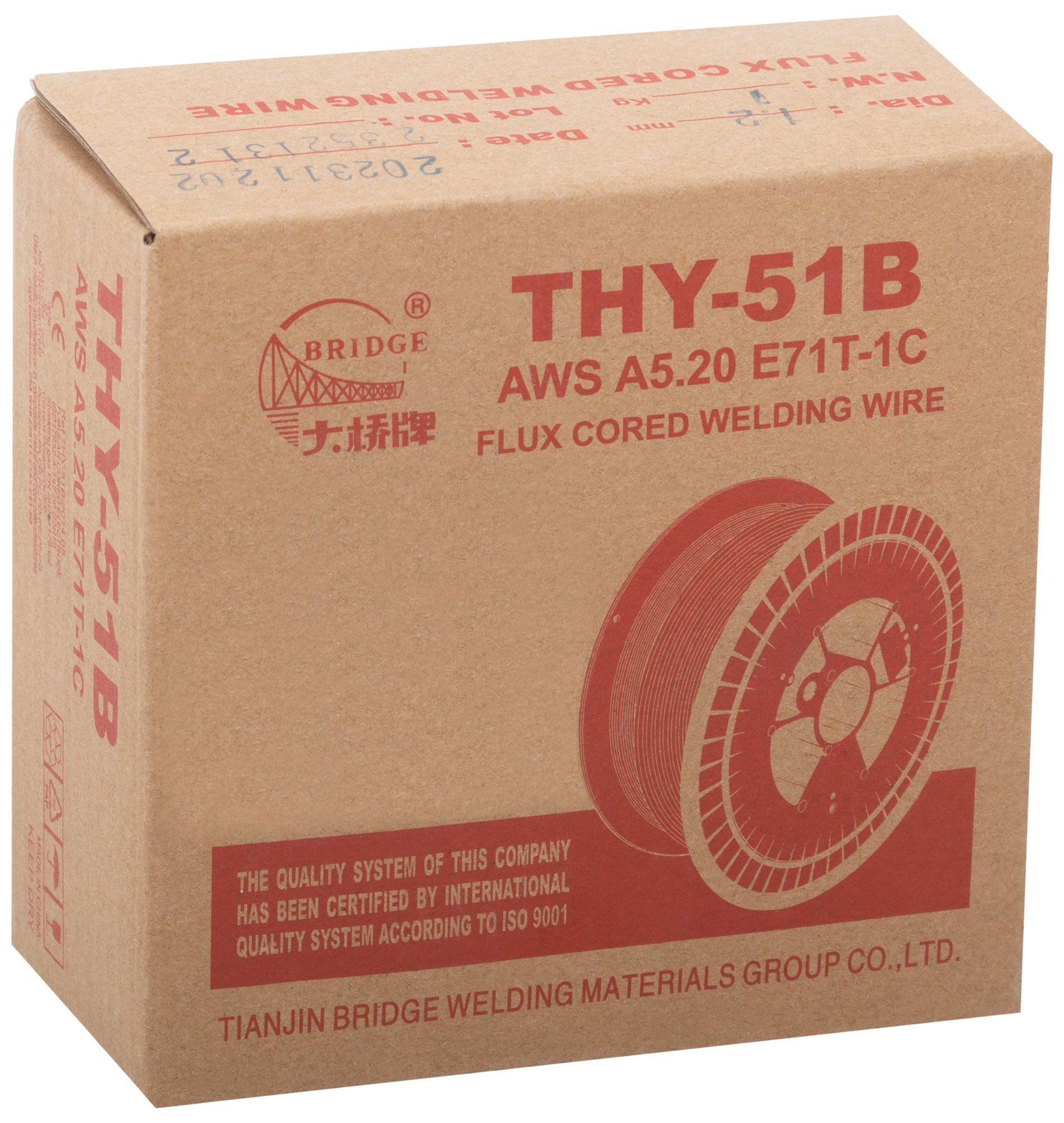 BRIDGE THY-51В - рутиловая порошковая электродная сварочная проволока. Классификации: GB: T10045 E501T-1, AWS A5.36 E71T1-C1A0-CS1, ISO 17632-A-T422PC2H10. Предназначена для сварки в среде защитного газа (СО2, сварочная смесь) гальванизированной углеродистой и низколегированной стали в любом пространственном положении полуавтоматом Mig Mag, марка по AWS E71T-C1. Сварка позиций: PA, PB, PC, PD, PE, PF.