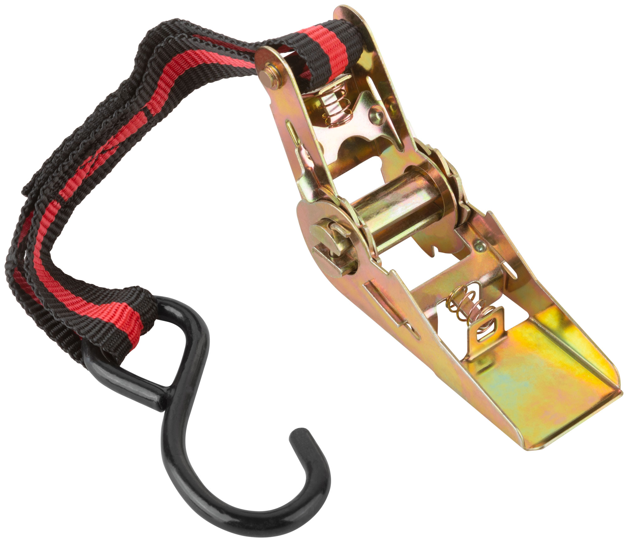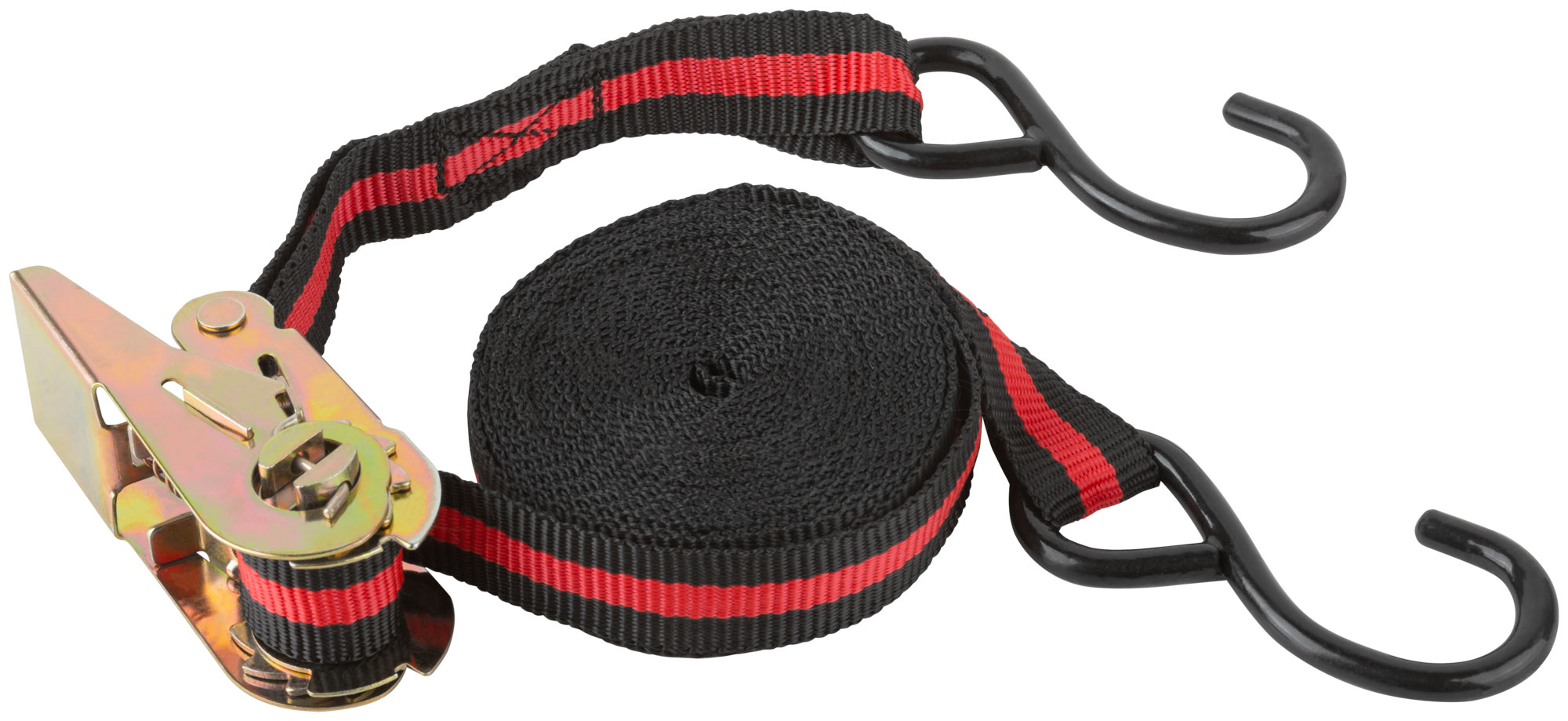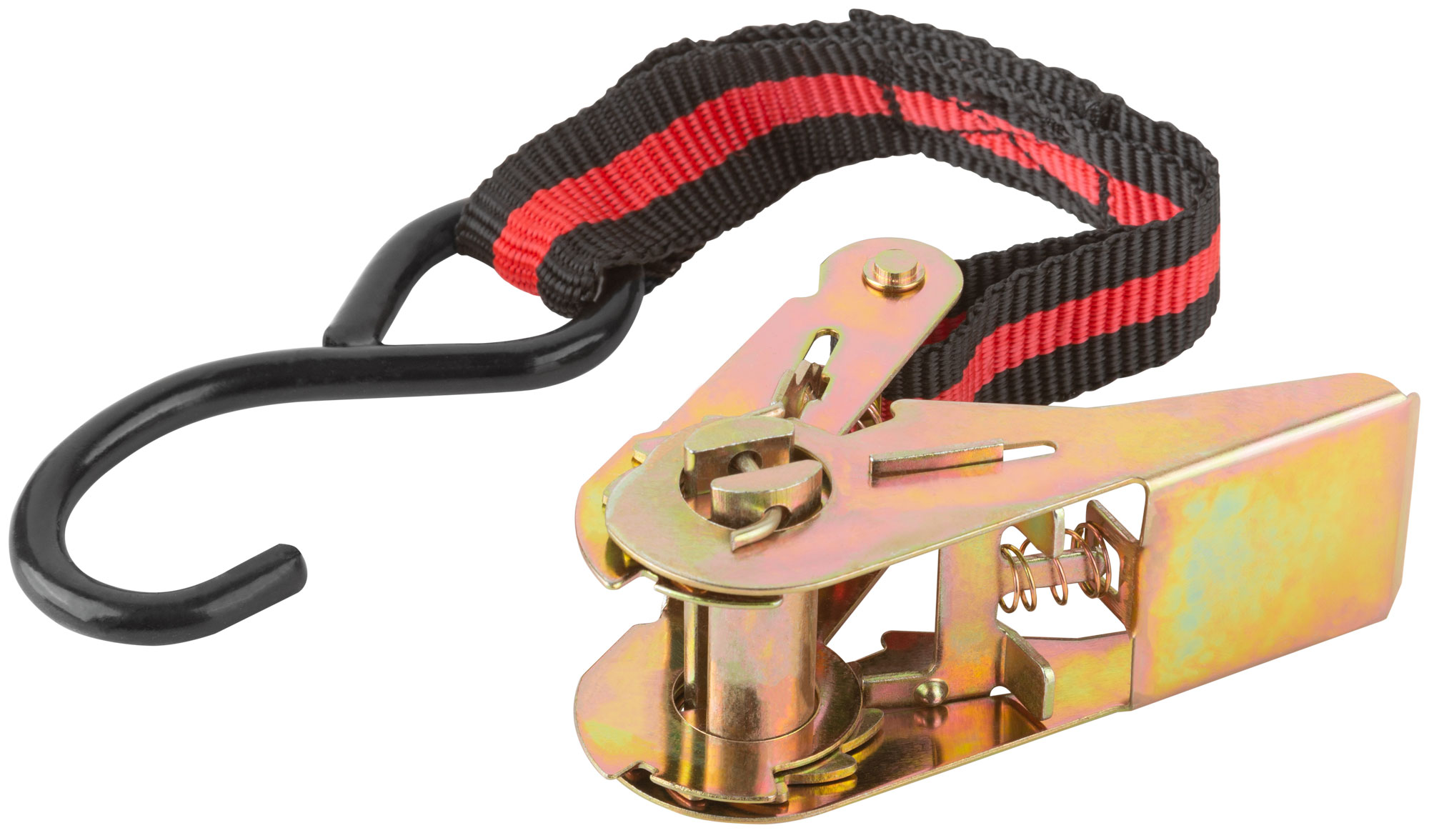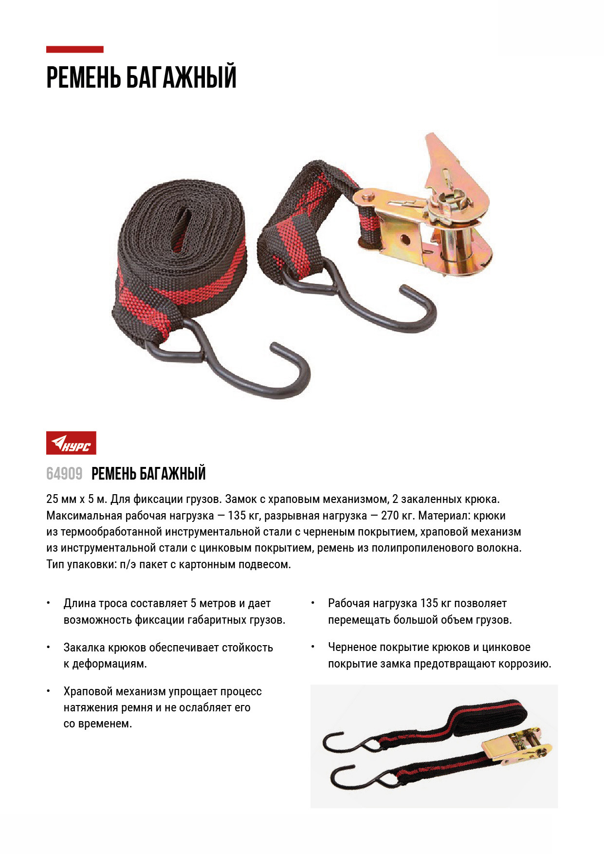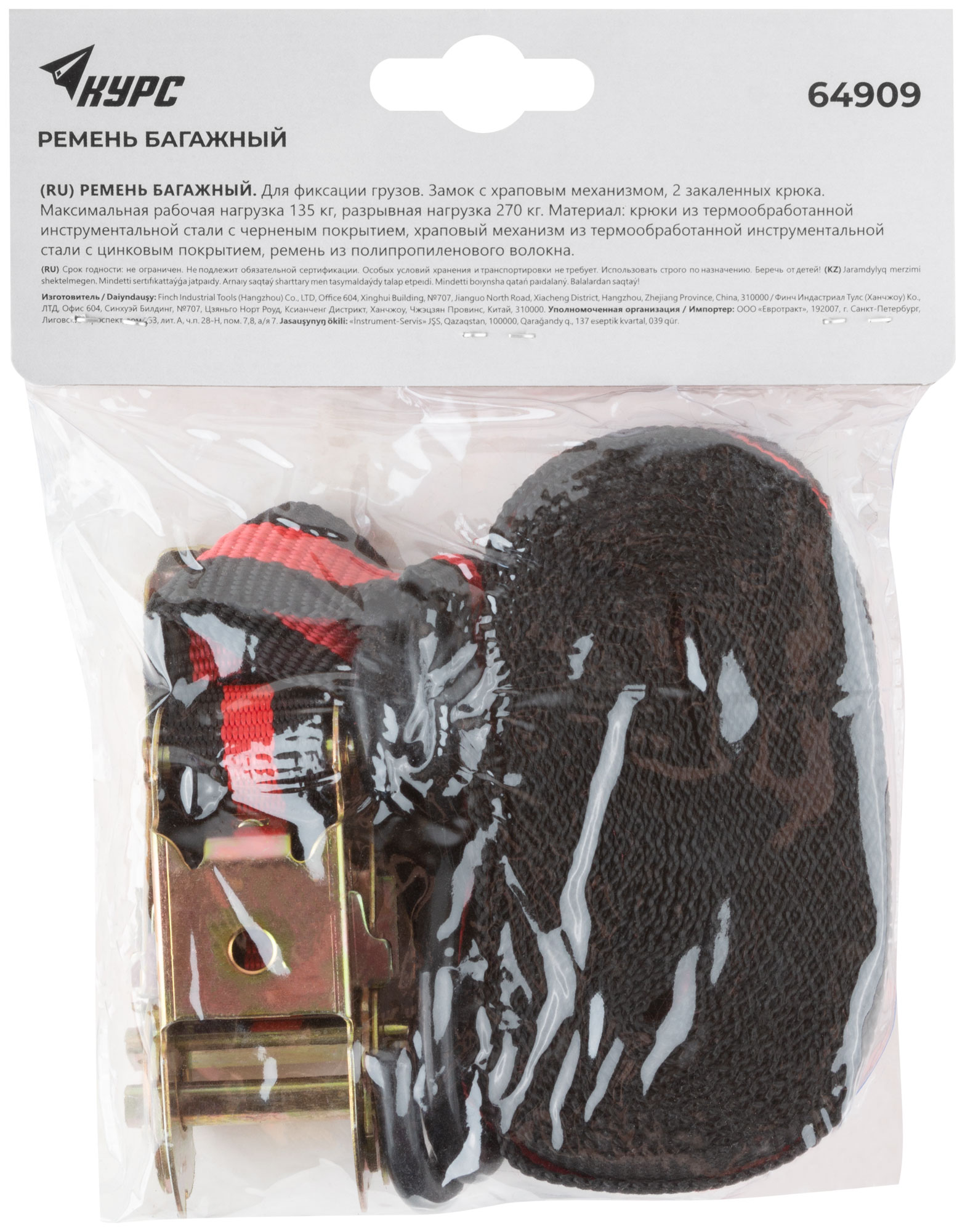 Для фиксации грузов. Замок с храповым механизмом, 2 закаленных крюка. Максимальная рабочая нагрузка 135 кг, разрывная нагрузка 270 кг. Материал: крюки из термообработанной инструментальной стали с черненым покрытием, храповый механизм из инструментальной стали с цинковым покрытием, ремень из полипропиленового волокна. Упаковка: П/Э пакет с картонным подвесом.