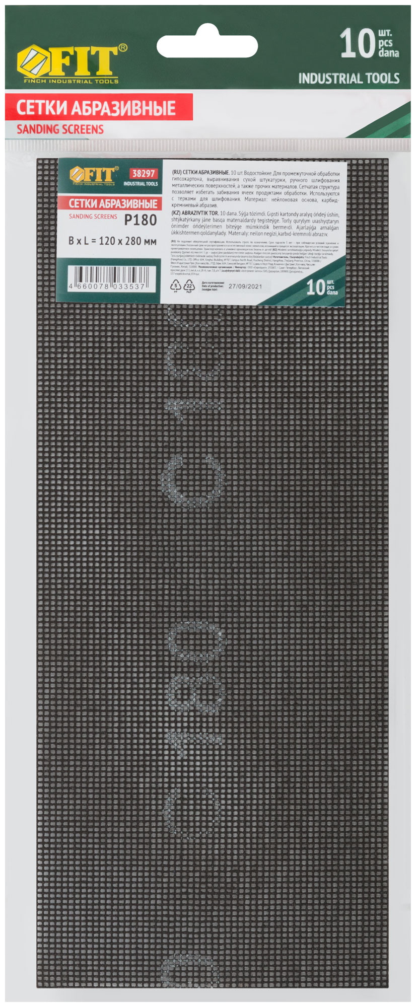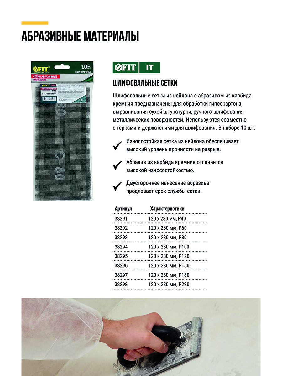Набор 10 шт. Водостойкие. 120 х 280 мм. Для обработки гипсокартона, выравнивания сухой штукатурки, ручного шлифования металлических поверхностей, а также прочих материалов. Сетчатая структура позволяет избегать забивания ячеек продуктами обработки. Материал: нейлон, карбид-кремниевый абразив. Упаковка: полипропиленовый пакет с картонным подвесом.