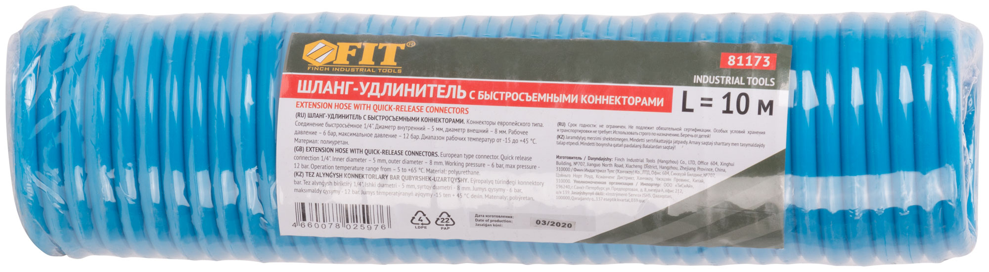 Шланг-удлинитель с коннекторами европейского типа. Соединение быстросъёмное 1/4". Диаметр внутренний - 5 мм, диаметр внешний – 8 мм.Рабочее давление – 6 бар, максимальное давление – 12 бар. Диапазон рабочих температур от -15 до +45 °С. Материал: полиуретан.