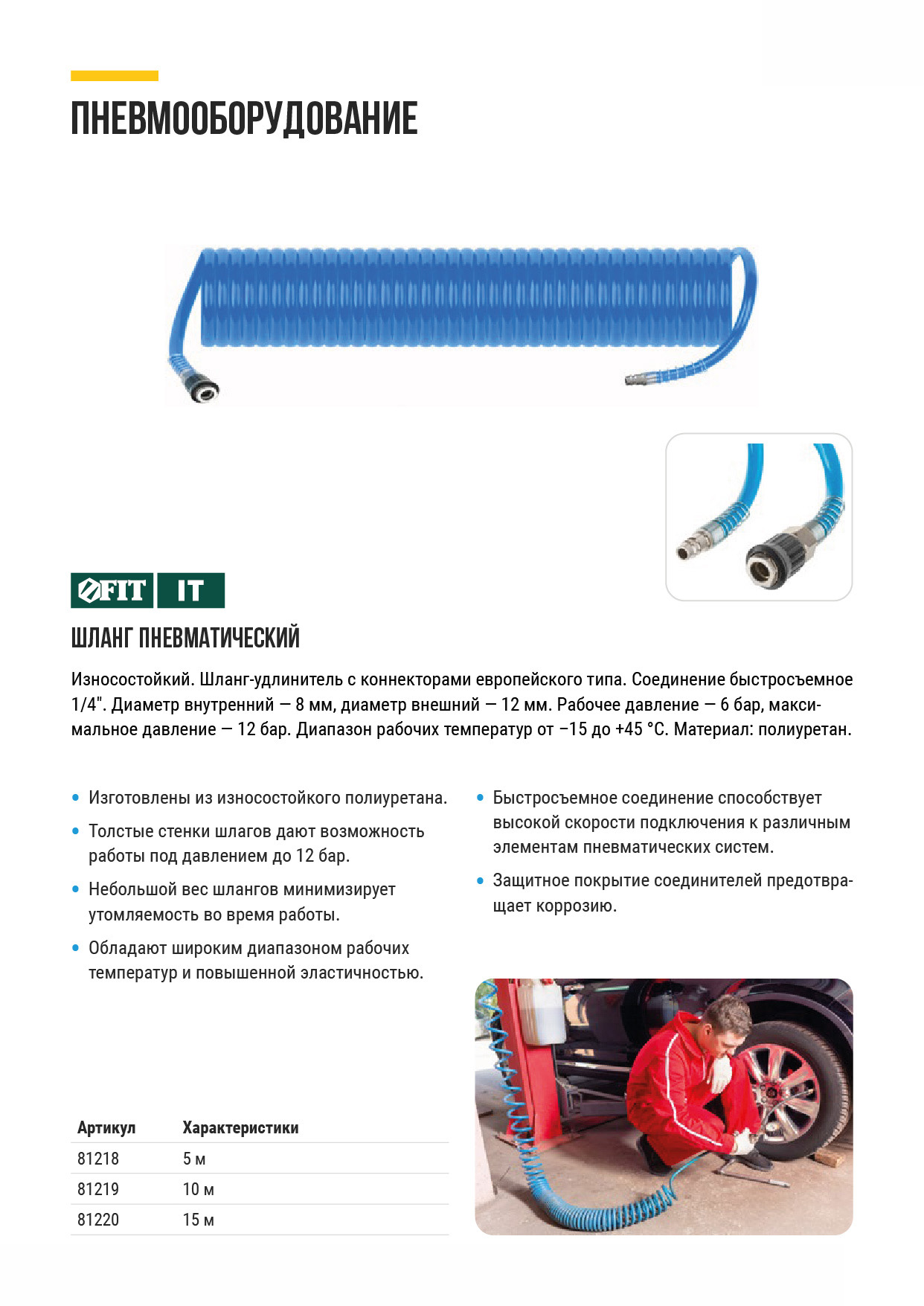 Износостойкий. Шланг-удлинитель с коннекторами европейского типа. Соединение быстросъемное 1/4". Диаметр внутренний - 8 мм, диаметр внешний - 12 мм. Рабочее давление - 6 бар, максимальное давление - 12 бар. Диапазон рабочих температур от -15 до +45 °С. Материал: полиуретан.