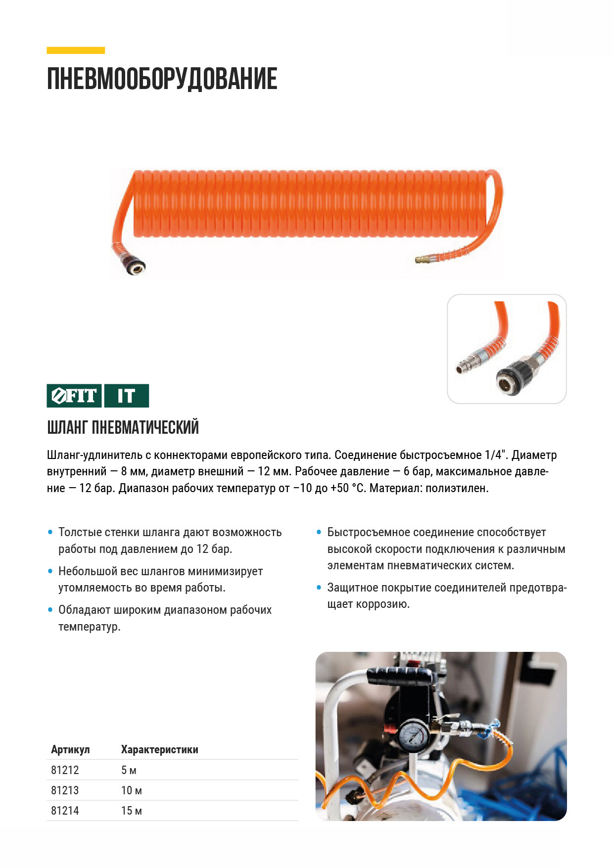 Шланг-удлинитель с коннекторами европейского типа. Соединение быстросъемное 1/4". Диаметр внутренний - 8 мм, диаметр внешний - 12 мм. Рабочее давление - 6 бар, максимальное давление - 12 бар. Диапазон рабочих температур от -10 до +50 °С. Материал: полиэтилен.
