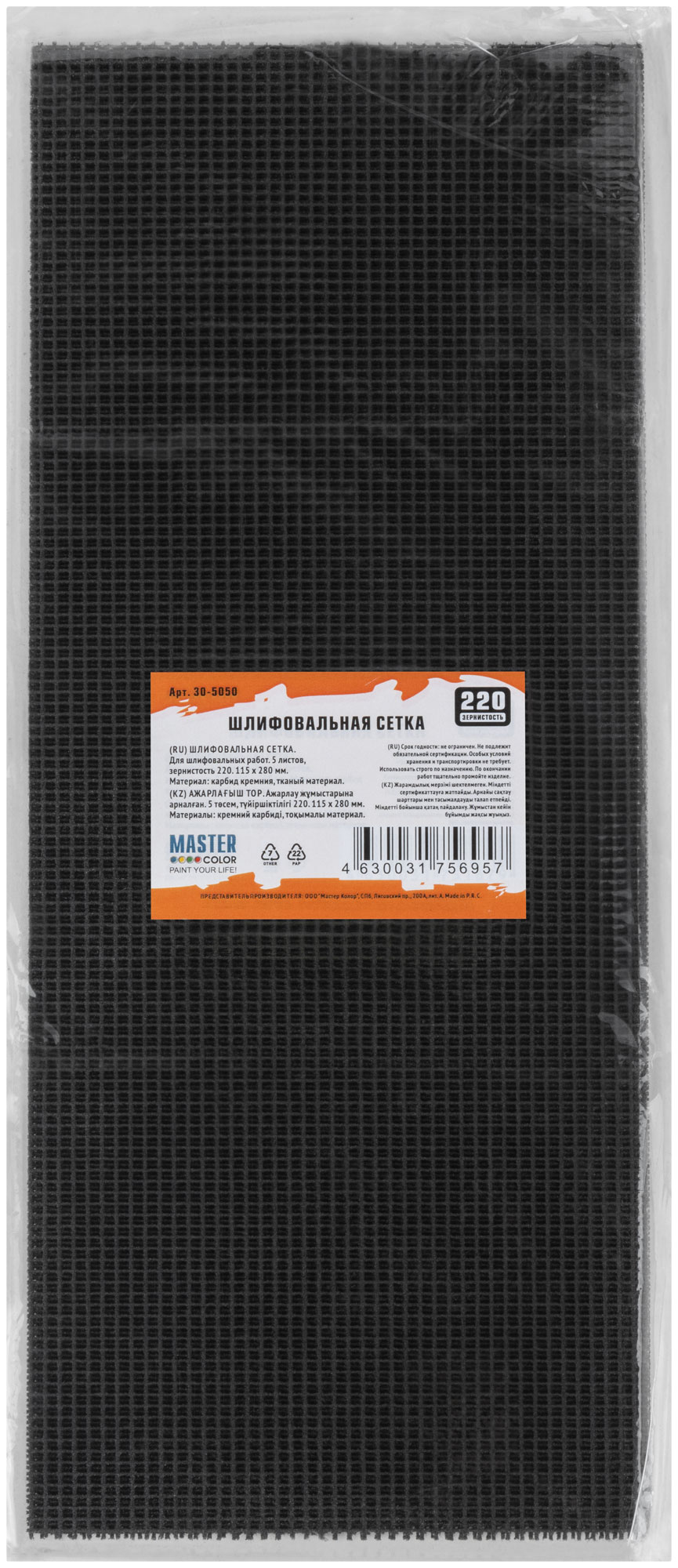 Шлифовальная сетка, 5 листов, зернистость 220, 115*280 мм, карбид кремния