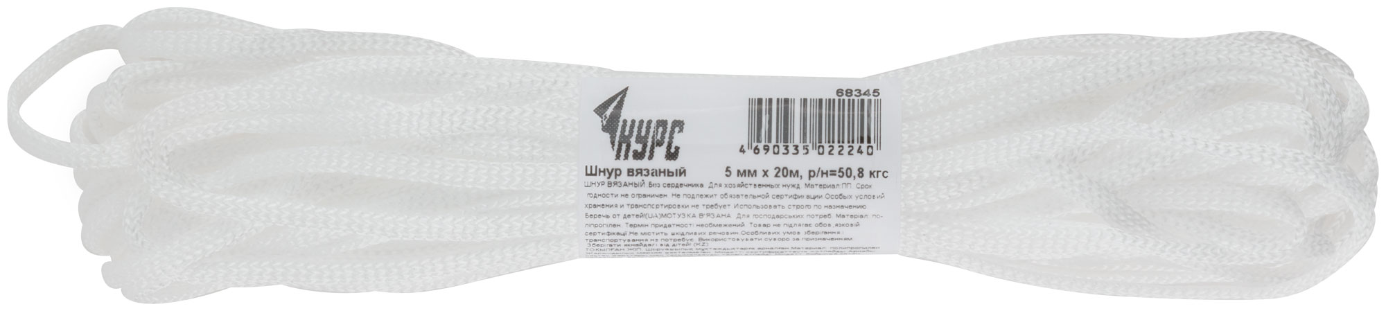 Шнур вязаный полипропиленовый без сердечника 5 мм х 20 м, р/н= 50,8 кгс