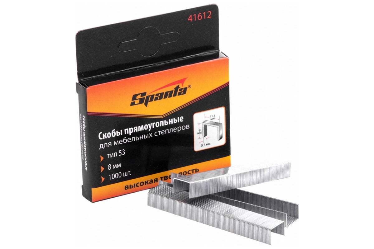 П-образные скобы Sparta 41612 типа 53, размером 8 х 11,3 х 0,7 мм, 1000 шт. в упаковке, заправляются в мебельные степлеры. Подходят для закрепления древесины, фанеры, ДСП, оргалита, картона, и других материалов. Пригодятся для проведения ремонтных и облицовочных работ, а также обивки мебели.