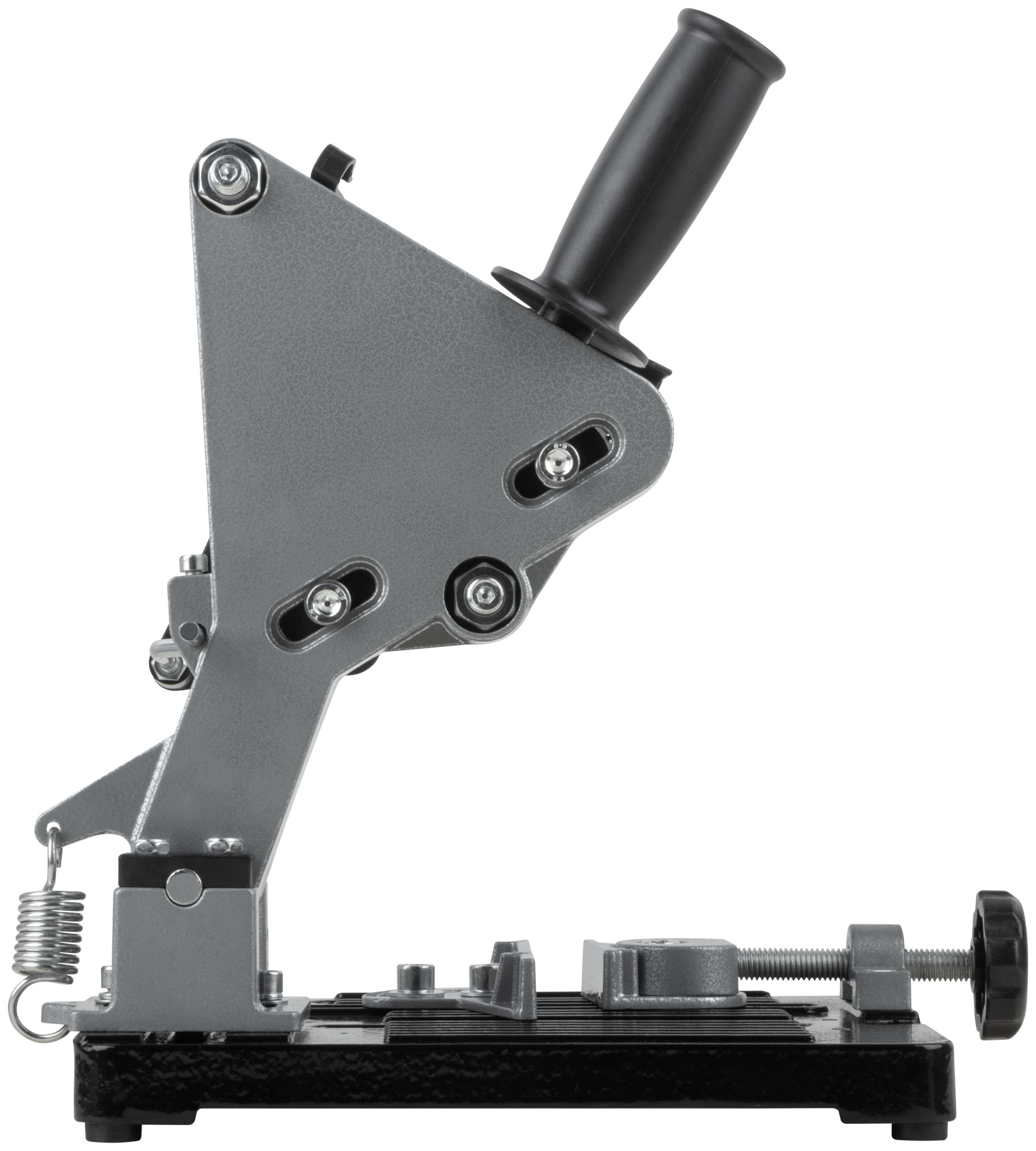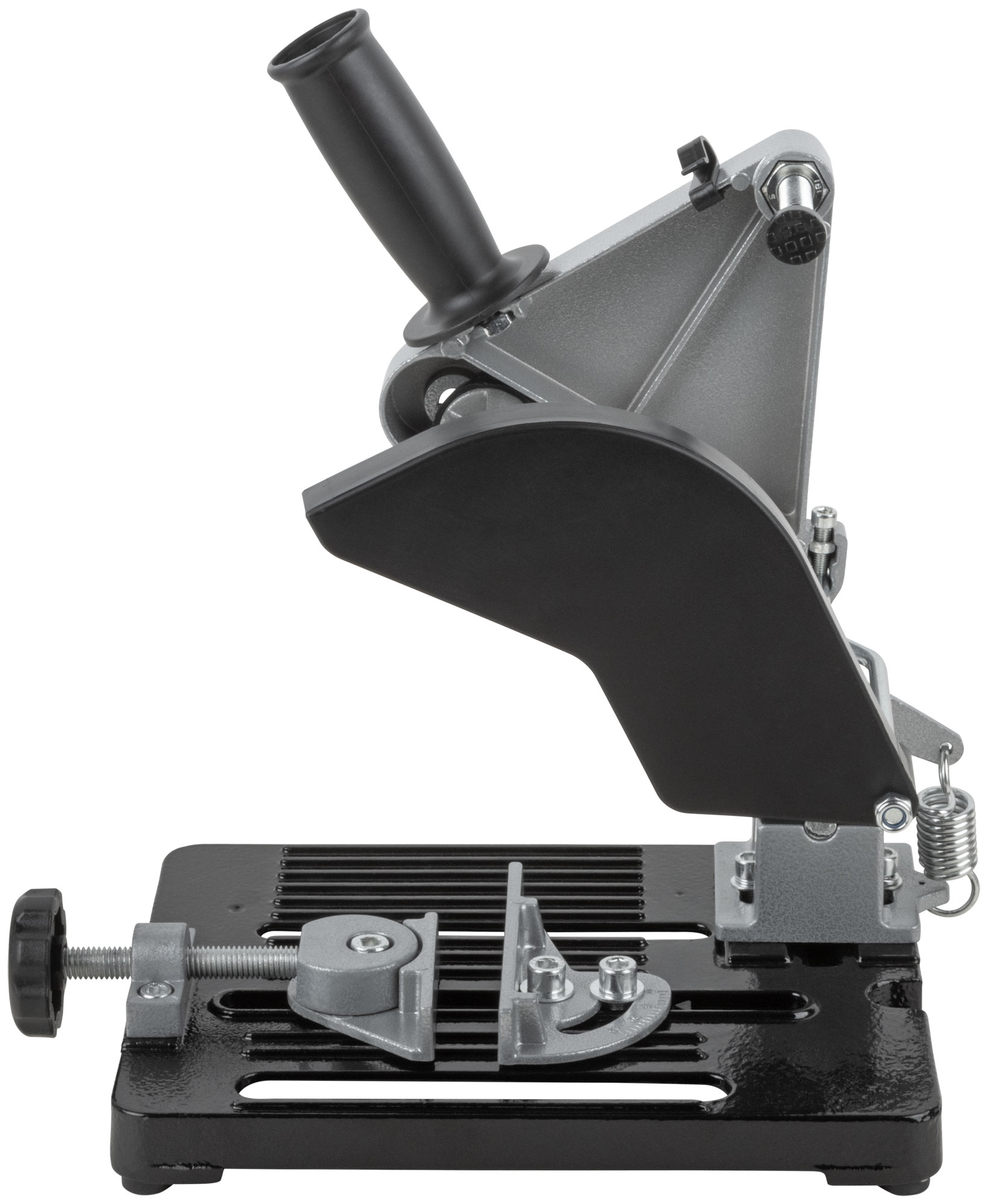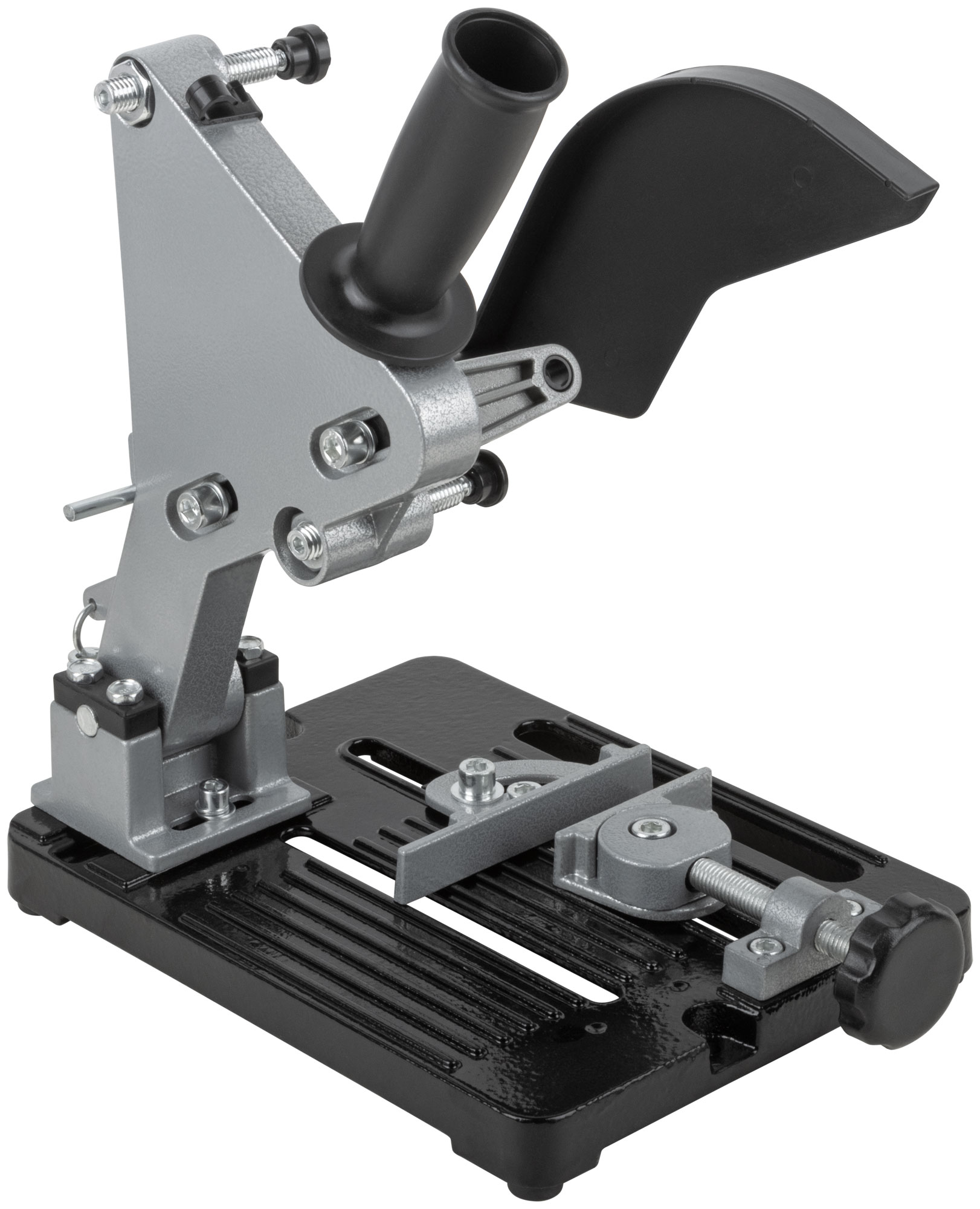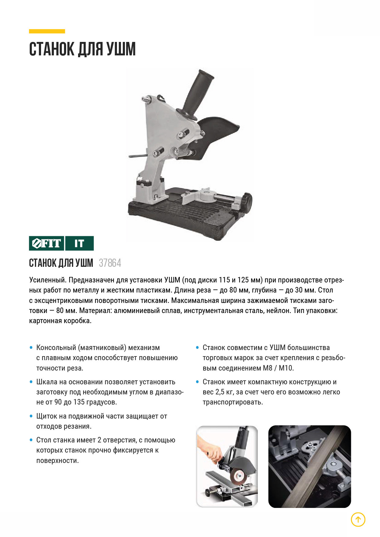 Усиленный. Предназначен для установки УШМ (под диски 115 и 125 мм) при производстве отрезных работ по металлу и жестким пластикам. Длина реза до 80 мм, глубина - до 30 мм. Стол с эксцентриковыми поворотными тисками. Максимальноая ширина заготовки, зажимаемой тисками - 80 мм. Материал: алюминиевый сплав, инструментальная сталь, нейлон. Упаковка: картонная коробка.