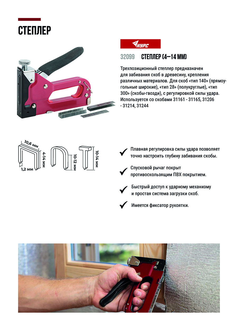 3-х позиционный. Для скоб «тип 140» (прямоугольные широкие), «тип 28» (полукруглые), "тип 300" (скобы-гвозди), с регулировкой силы удара. Используется со скобами 31151-31155, 31206-31214, 31220-31222, 31244. Металлический корпус, обрезиненный спусковой рычаг