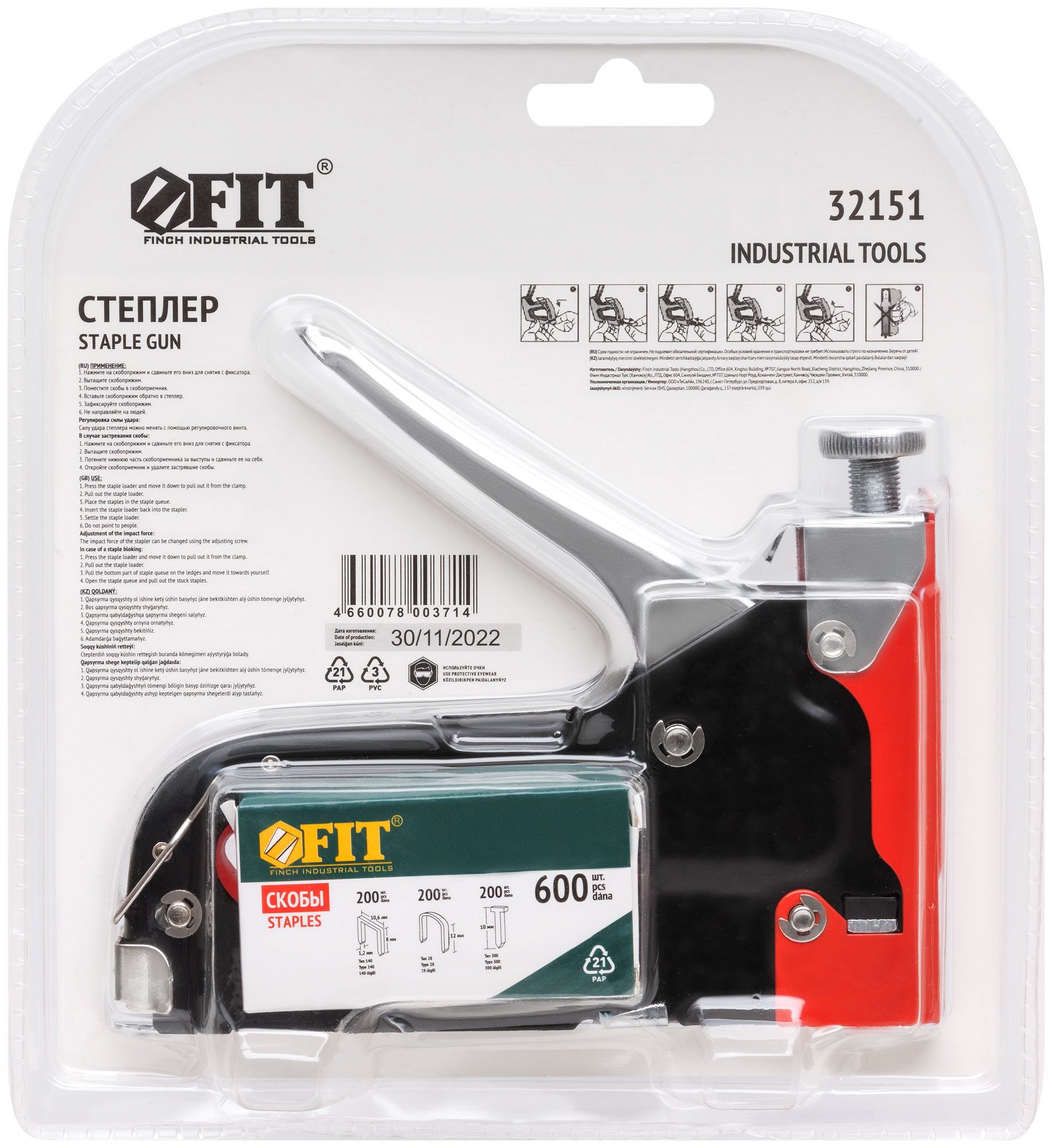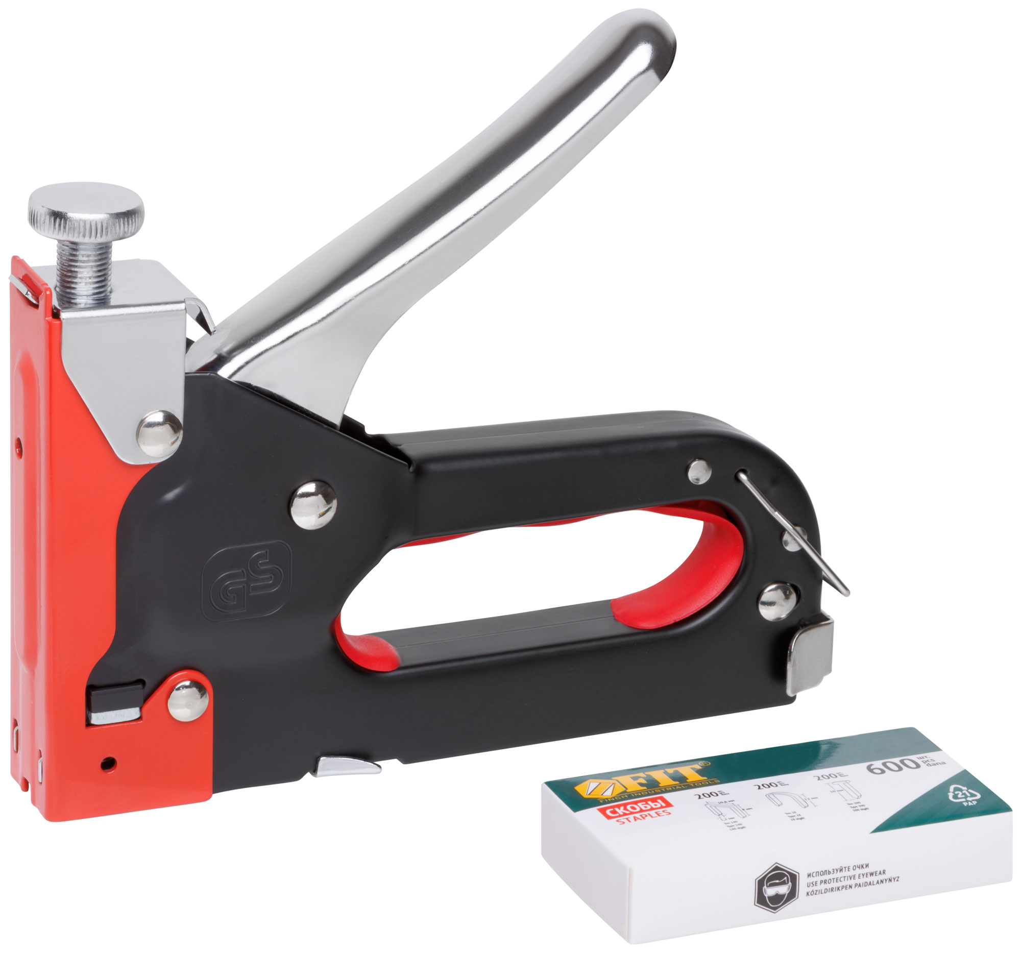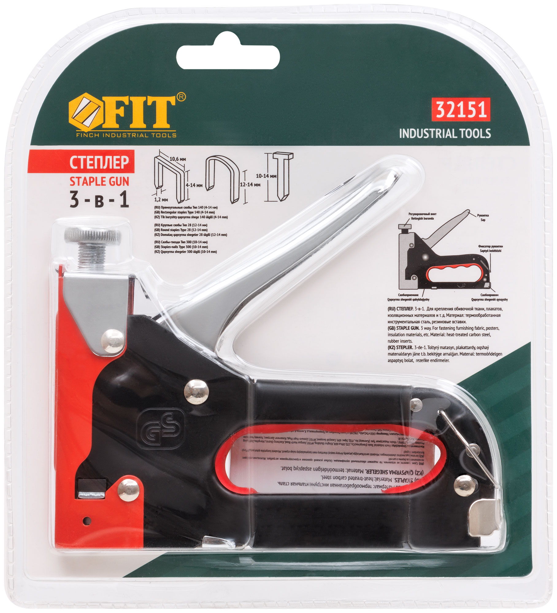 3-х позиционный. Для скоб "тип 140" (прямоугольные широкие), "тип 28" (круглые), "тип 300" (скобы-гвозди). С регулировочным винтом. Для закрепления обивки мебели, укрепления плакатов, закрепления проволочной сетки и строительства теплиц. Используется со скобами FIT 31204-31258. Упаковка: блистер