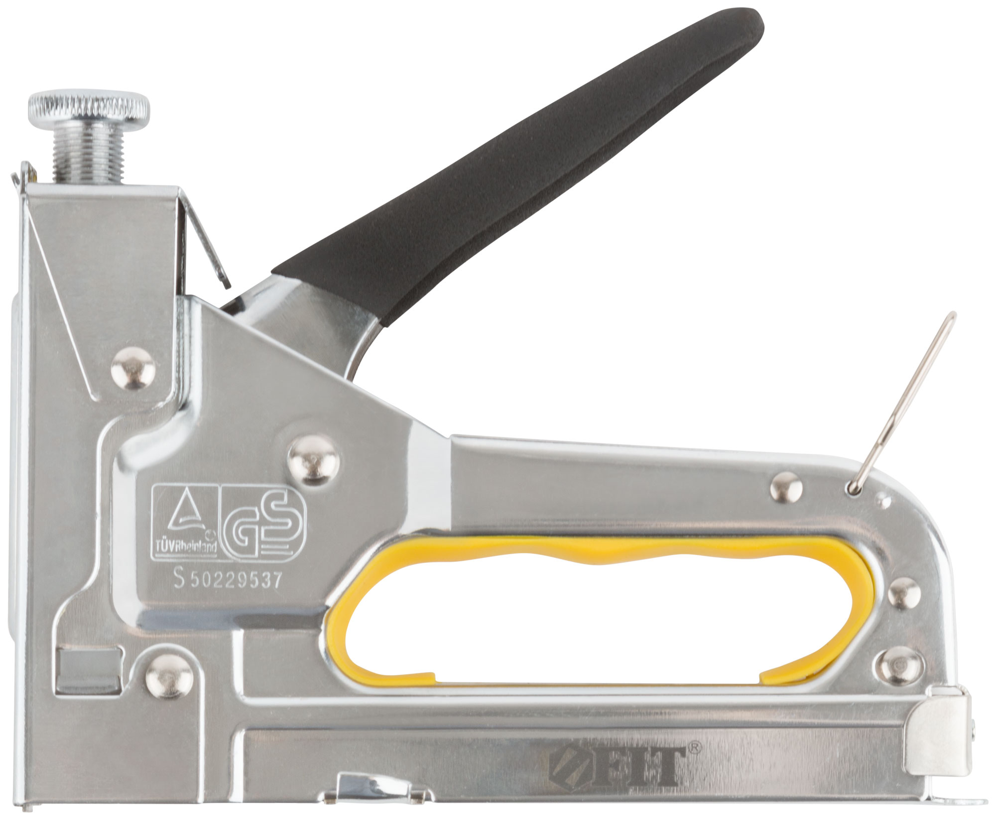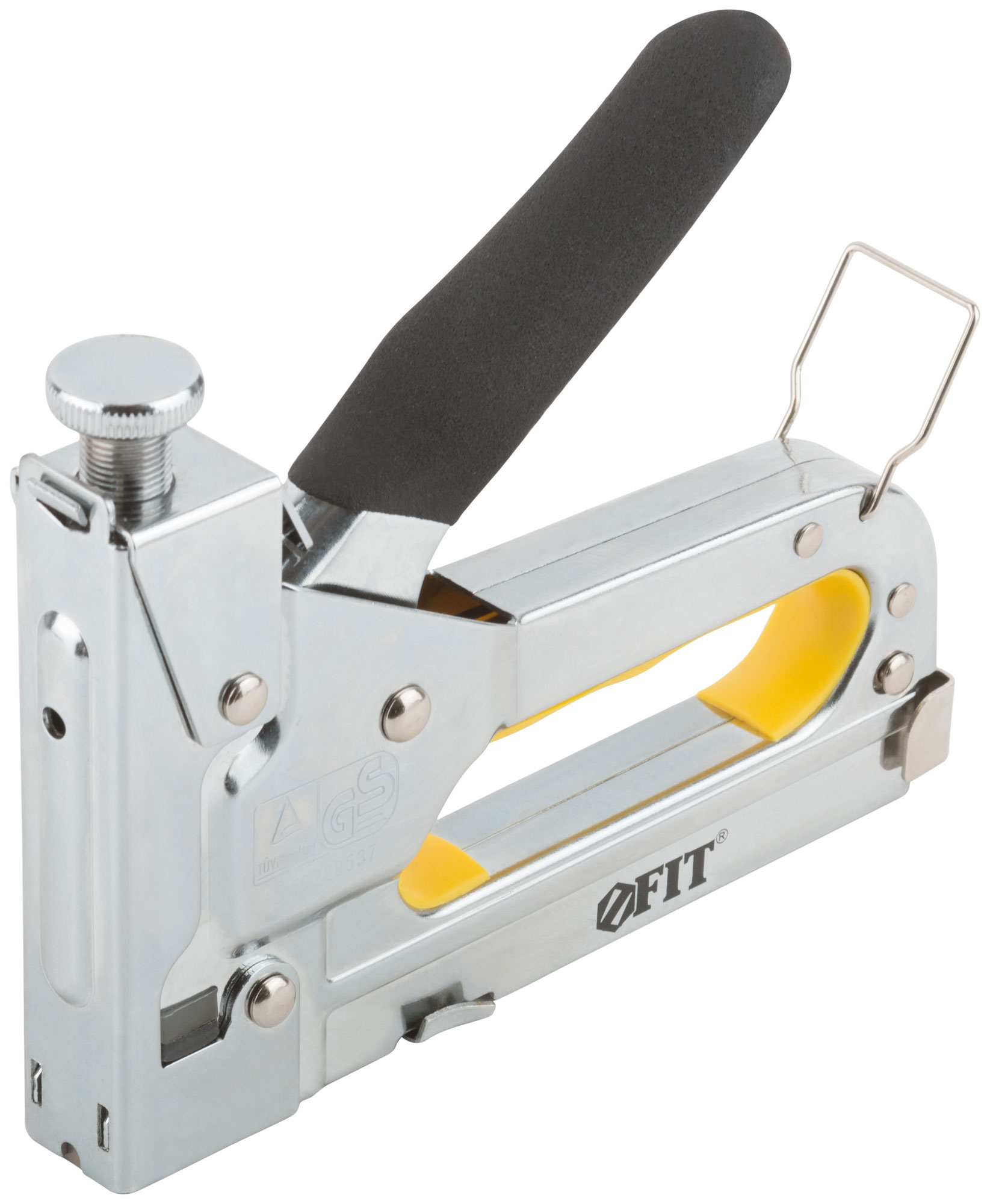 Для скоб "Тип 53". Металлический, с регулировочным винтом. Для закрепления обивки мебели, укрепления плакатов, закрепления проволочной сетки и строительства теплиц. Используется со скобами 31304-31314, 31326-31334, 31404-31414. Материал: корпус из инструментальной стали, внутренняя вставка из резины, ПВХ накладка на ручку. Упаковка: блистер.