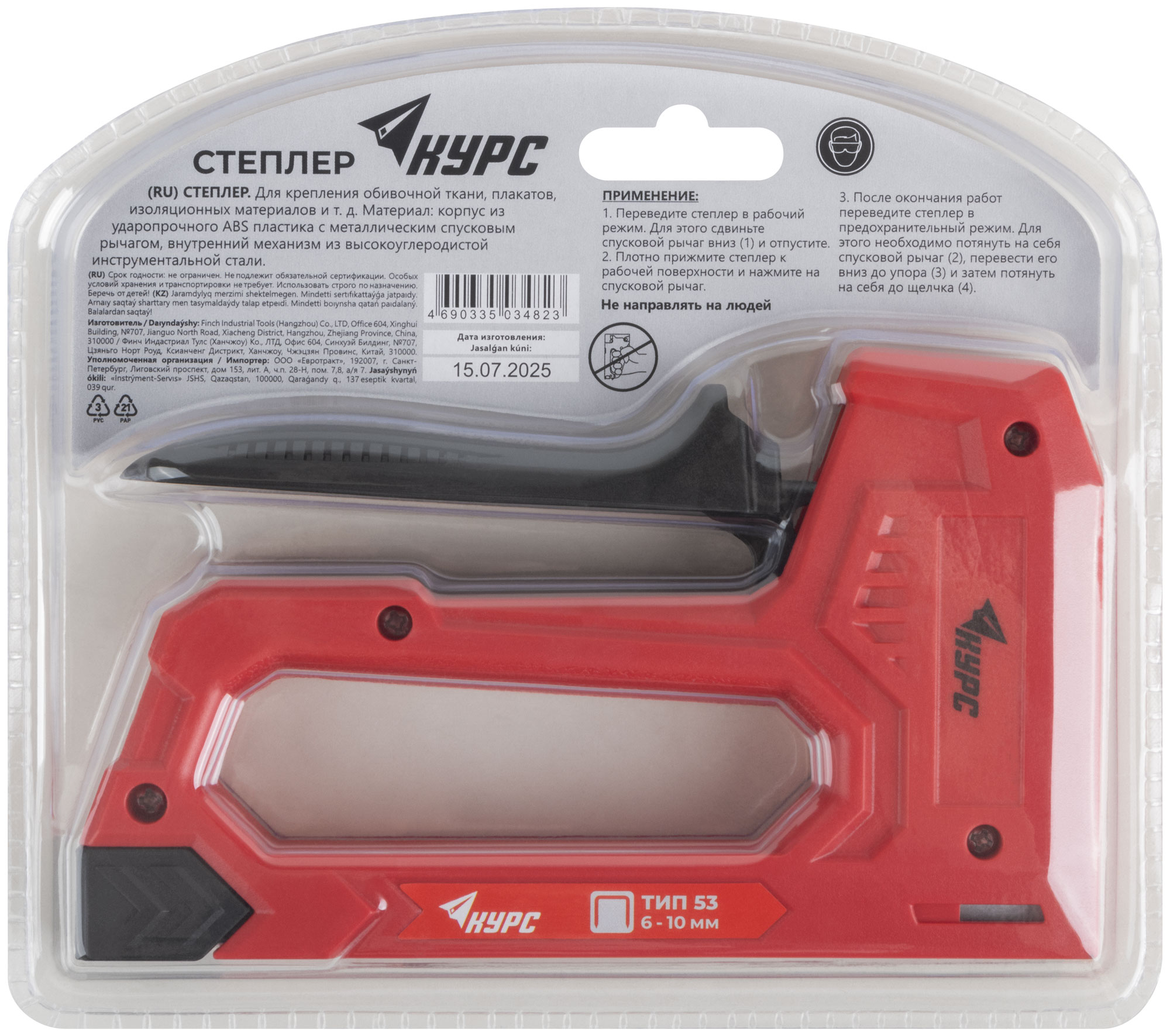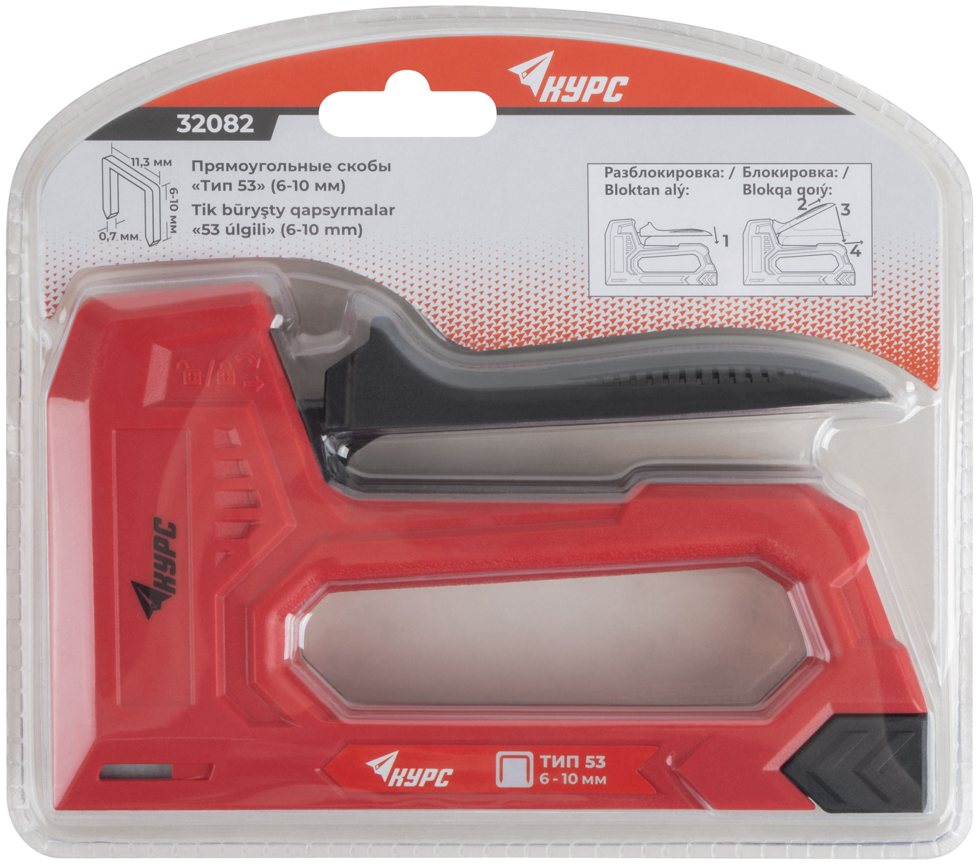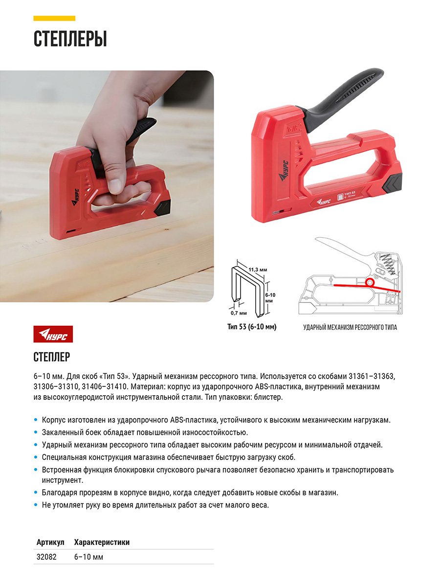 Для скоб «Тип 53». Ударный механизм рессорного типа. Используется со скобами 31361-31363, 31306-31310, 31406-31410. Материал: корпус из ударопрочного ABS пластика, внутренний механизм из высокоуглеродистой инструментальной стали. Упаковка: блистер.