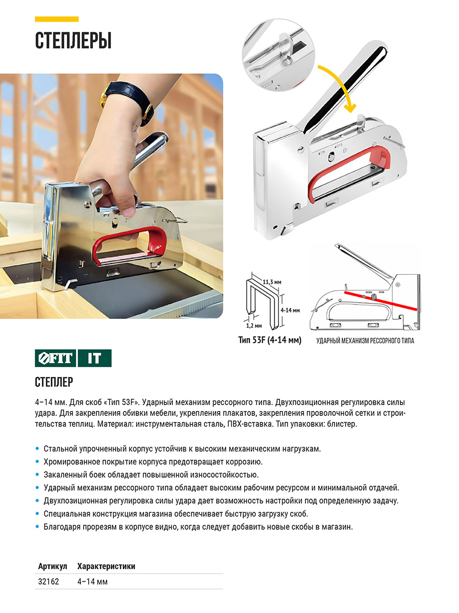 Для скоб «Тип 53F». Ударный механизм рессорного типа. Двухпозиционная регулировка силы удара. Для закрепления обивки мебели, укрепления плакатов, закрепления проволочной сетки и строительства теплиц. Материал: инструментальная сталь, ПВХ вставка. Упаковка: блистер.