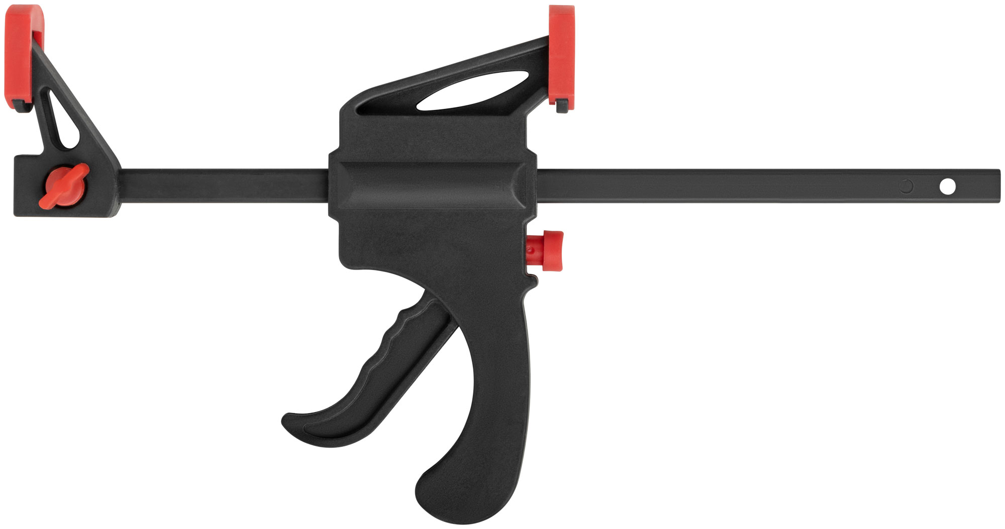 Быстрозажимная. Для фиксации деталей. Может использоваться как распорка при перестановке губок. Материал: нейлоновый корпус, армированный фибергласом, пластиковые губки, направляющая из инструментальной стали.