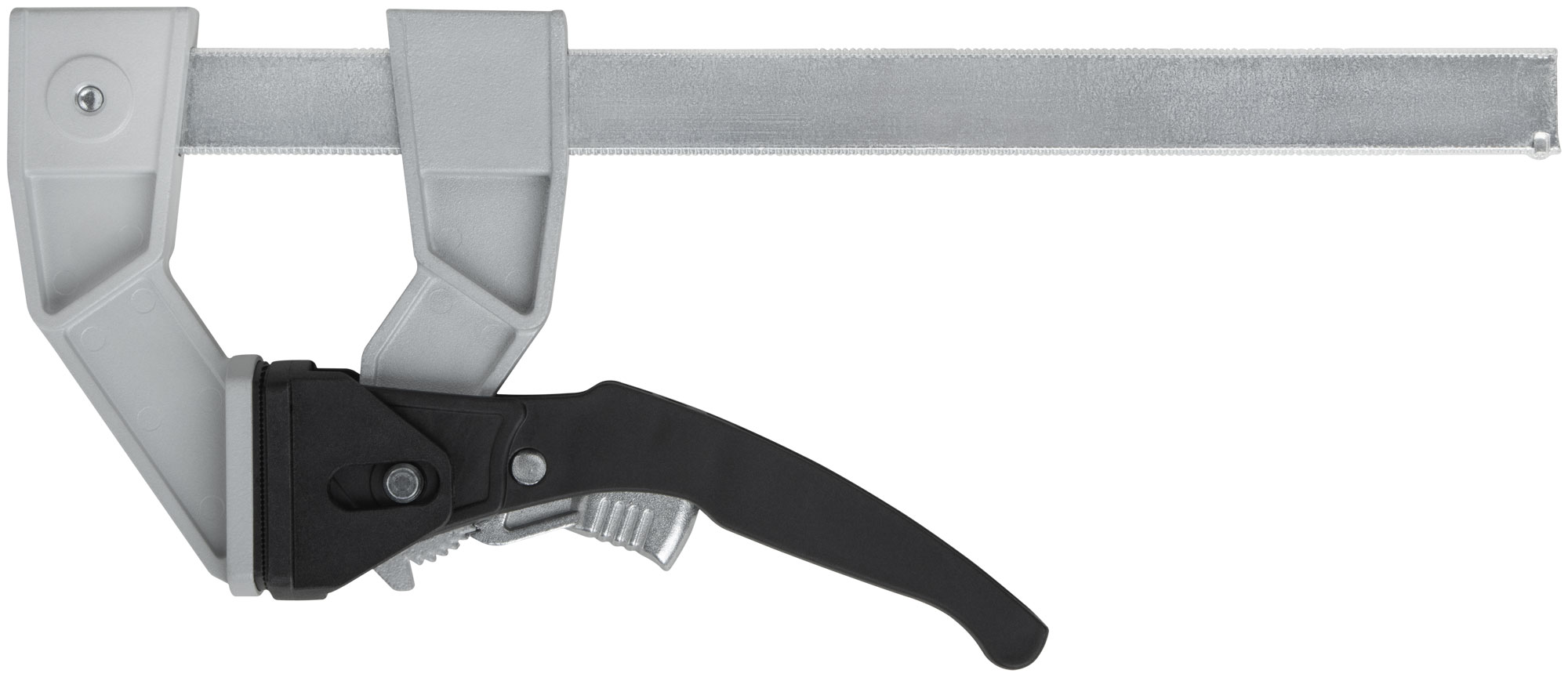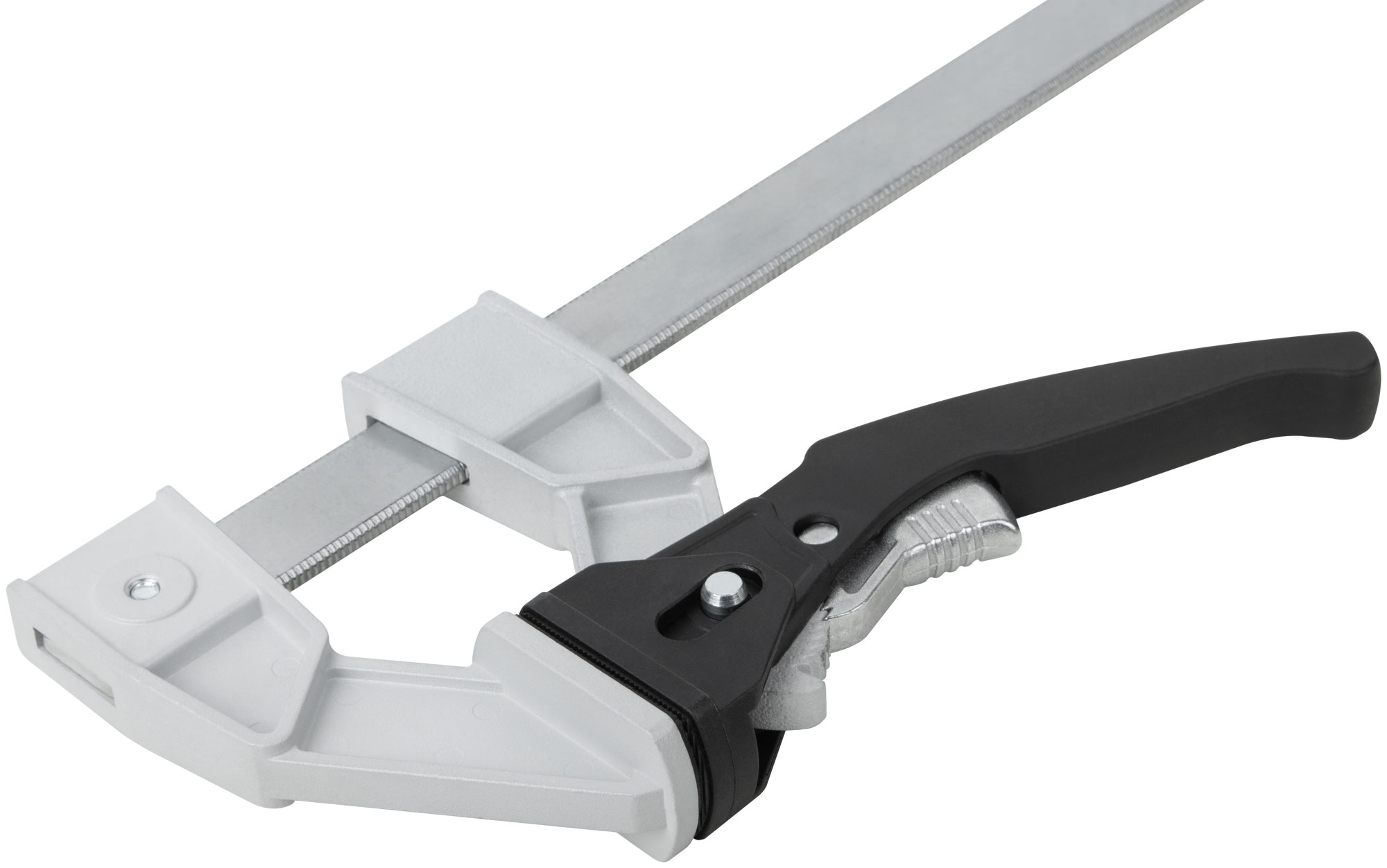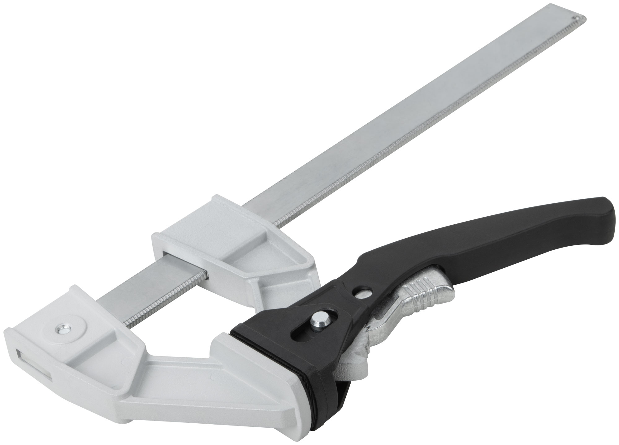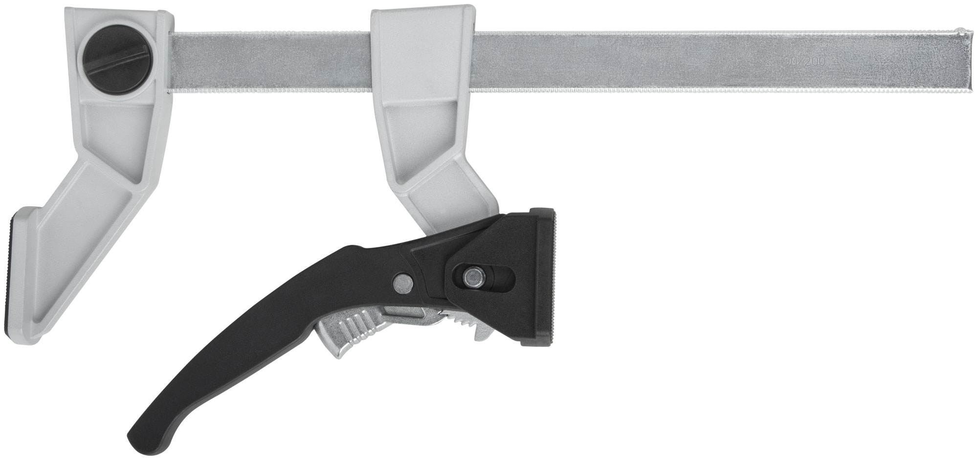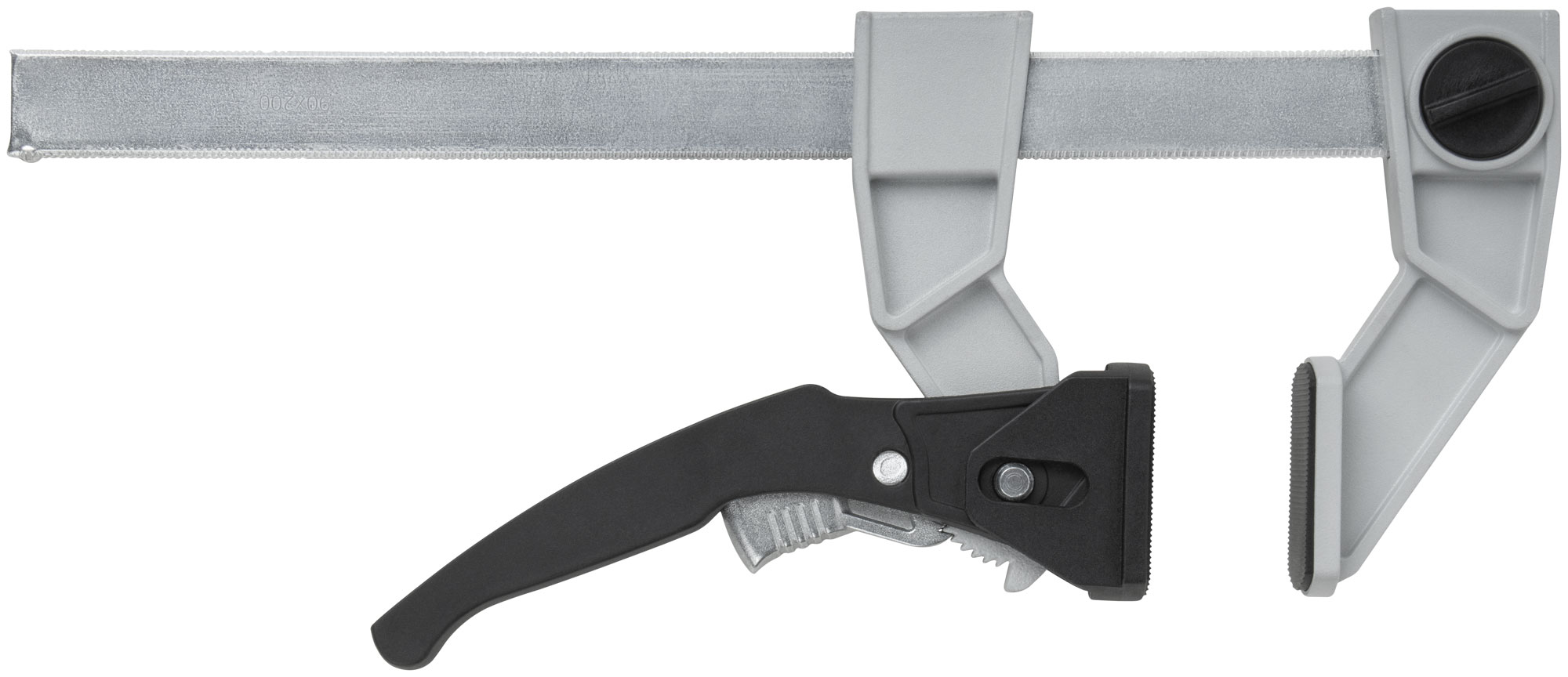 Профи. Для быстрой фиксации деталей при проведении столярных работ. Рычажный механизм с кнопкой быстрого сброса сжатия. Сила сжатия 200 кгс. Материал: рама из инструментальной стали, губки из алюминиевого сплава; ручка из полиамида, усиленного фибергласом; накладки на губки из нейлона.