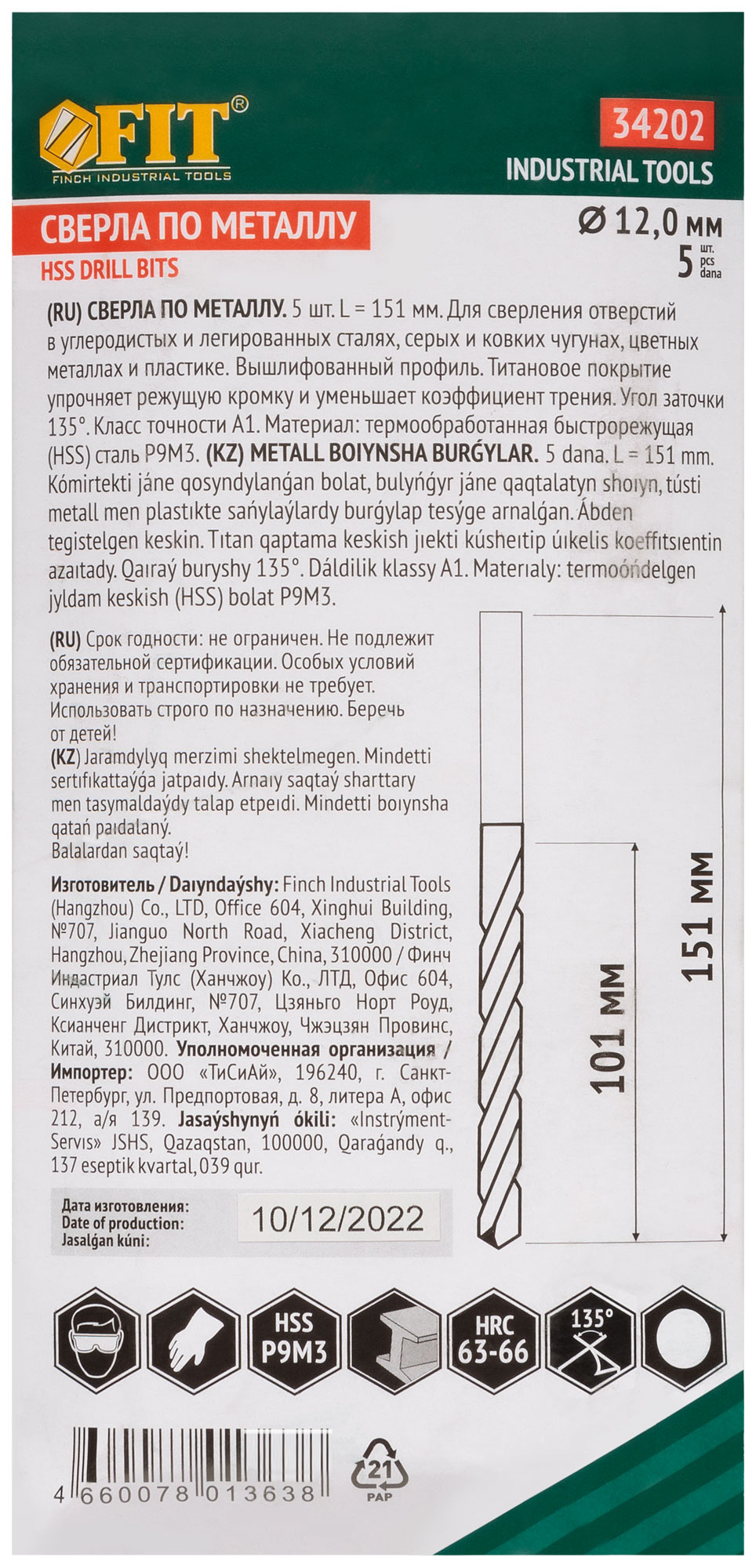Сверла HSS по металлу, титановое покрытие 12,0х151 мм ( 5 шт.)