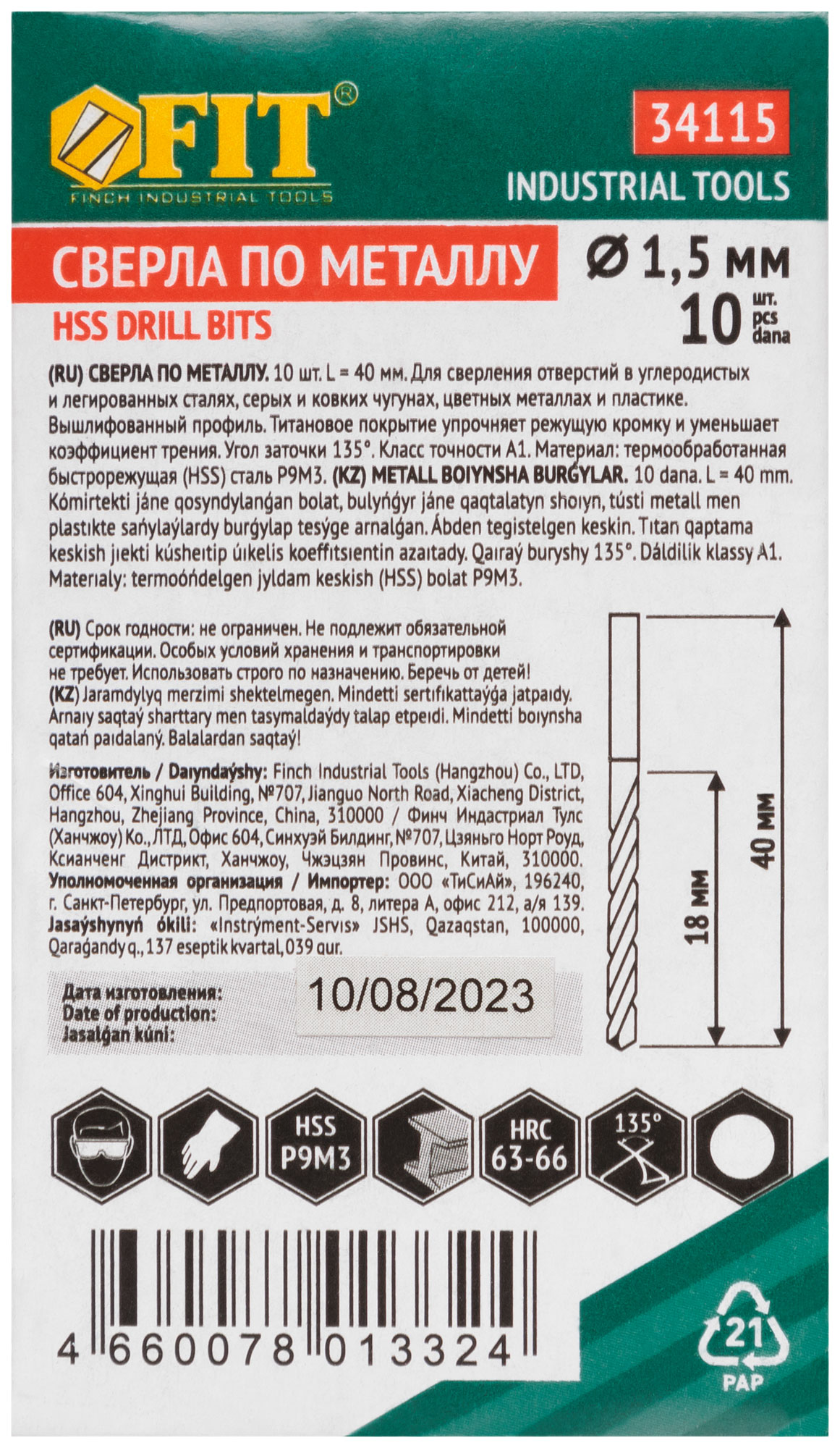 Цилиндрический хвостовик. Вышлифованный профиль. Класс точности А1. Угол заточки 135 градусов. Материал: быстрорежущая (HSS) сталь Р9М3 c титановым покрытием. Упаковка: картонный конверт.
