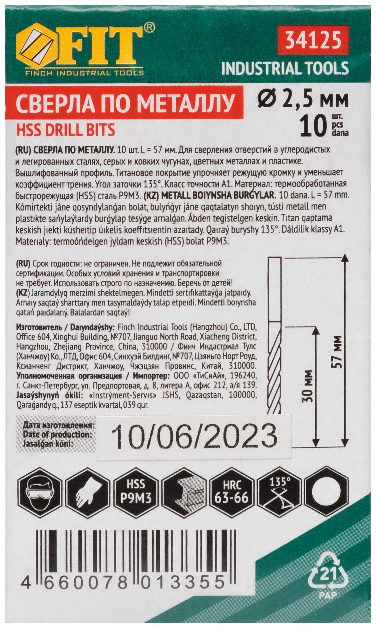 Сверла HSS по металлу, титановое покрытие 2,5х57 мм (10 шт.)