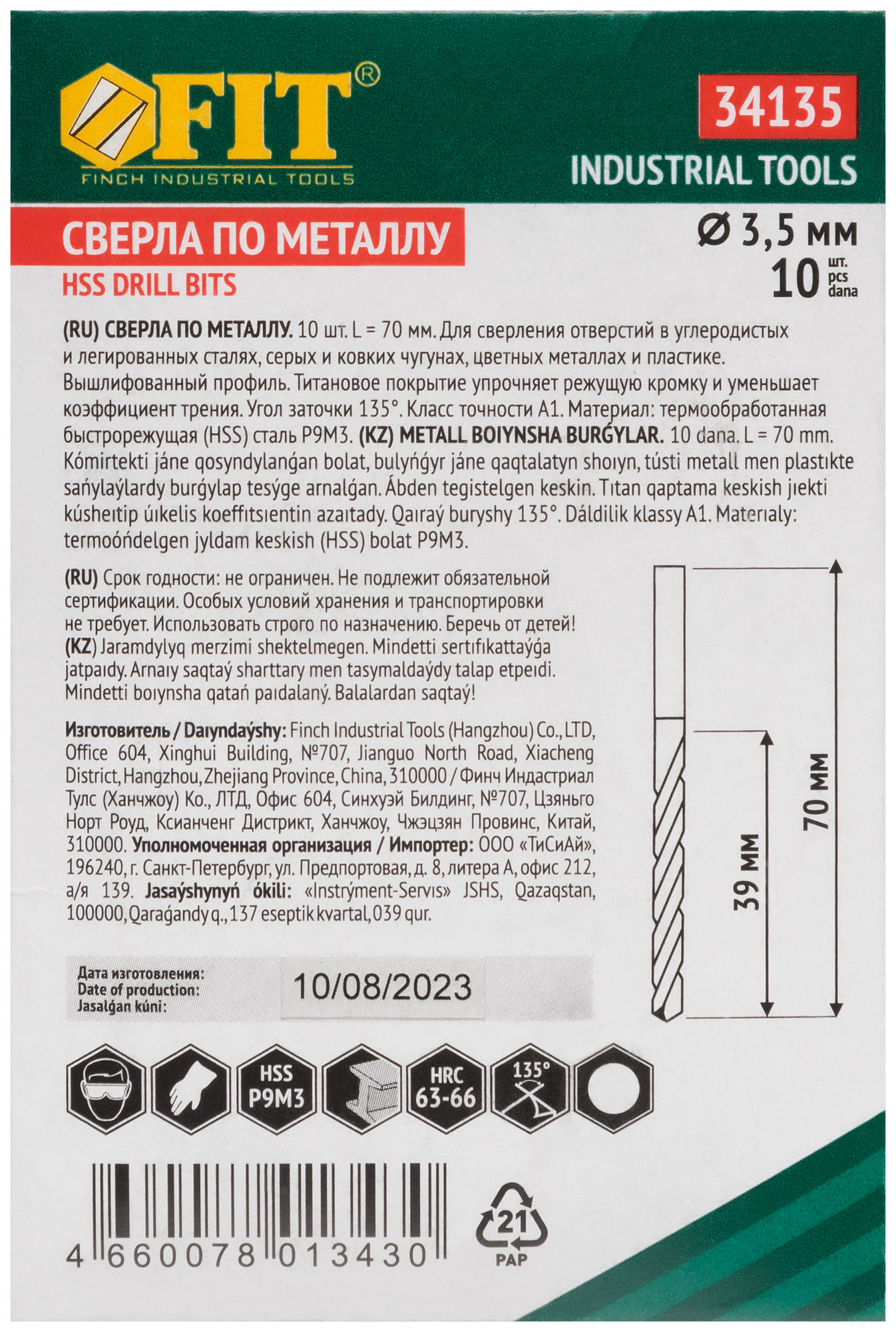 Сверла HSS по металлу, титановое покрытие 3,5х70 мм (10 шт.)