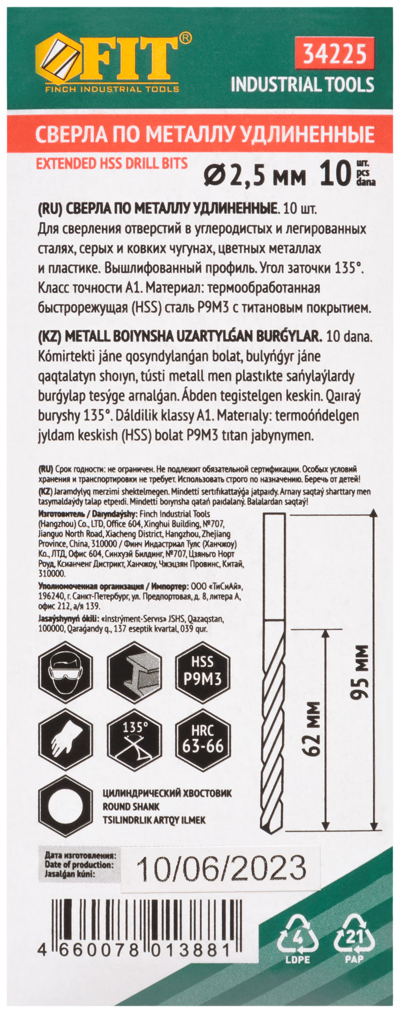 Сверла HSS по металлу, удлиненные, титановое покрытие 2,5х95 мм (10 шт.)