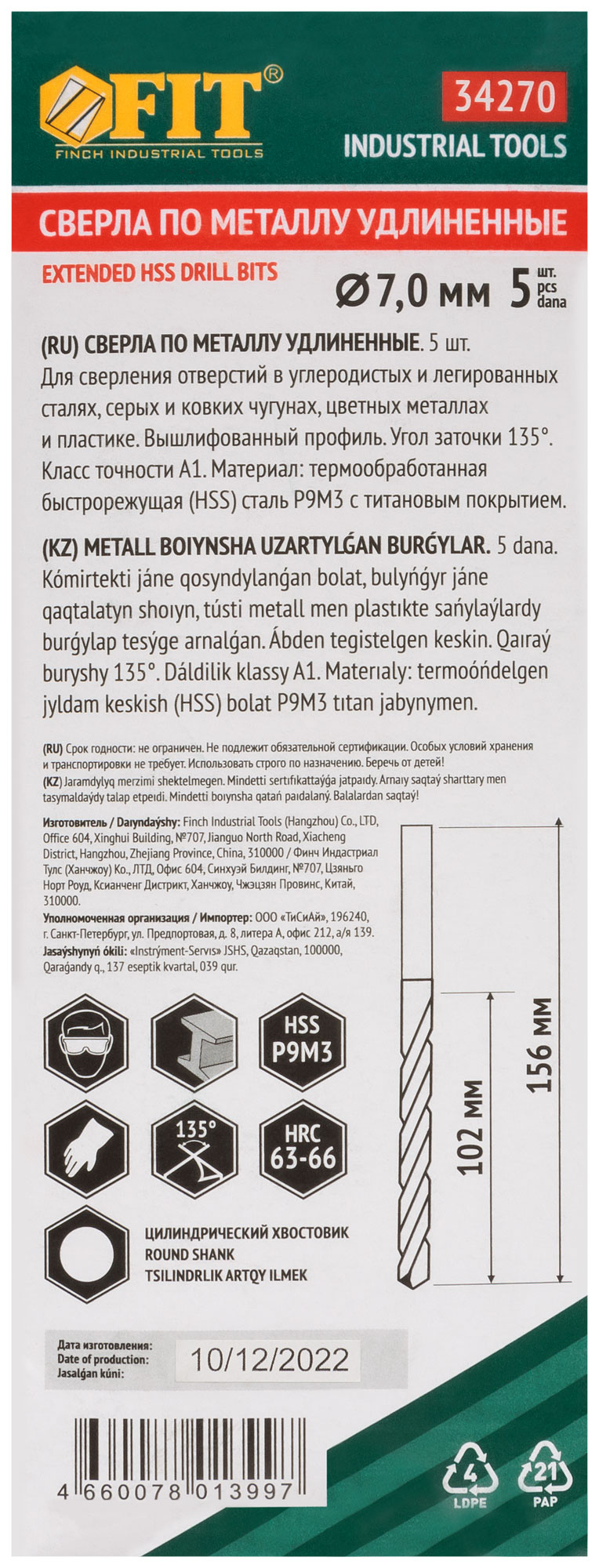 Сверла HSS по металлу, удлиненные, титановое покрытие 7,0х156 мм (5 шт.)