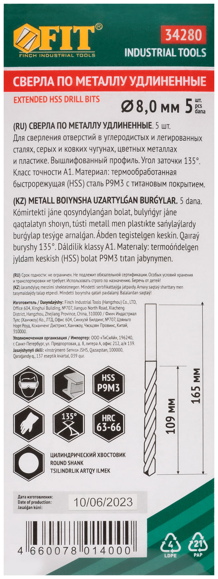 DIN 340, удлиненное. Цилиндрический хвостовик. Вышлифованный профиль. Класс точности А1. УголBзаточки 135 градусов. Материал: быстрорежущая (HSS) сталь Р9М3 c титановым покрытием. Упаковка: картонный конверт.