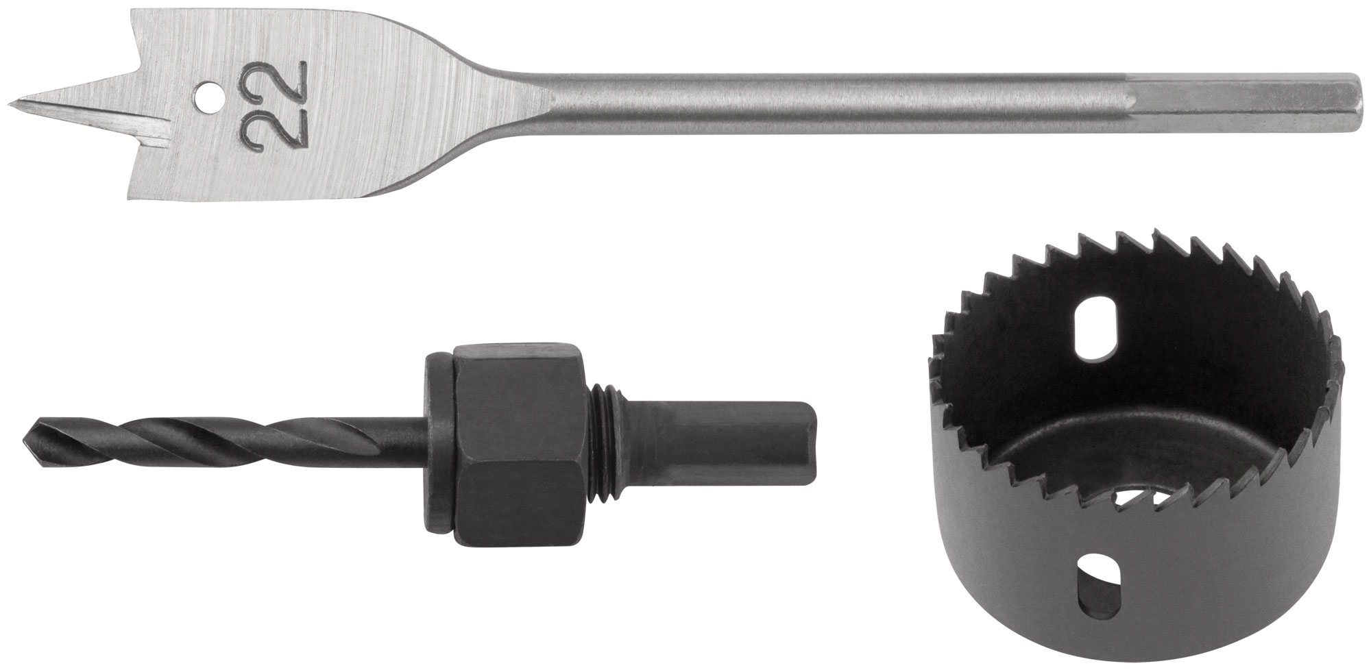 Набор из 3-х предметов. Сверло перовое D=22 мм, сверло направляющее D=6 мм, коронка кольцевая. Материал: инструментальная сталь. Упаковка: блистер.