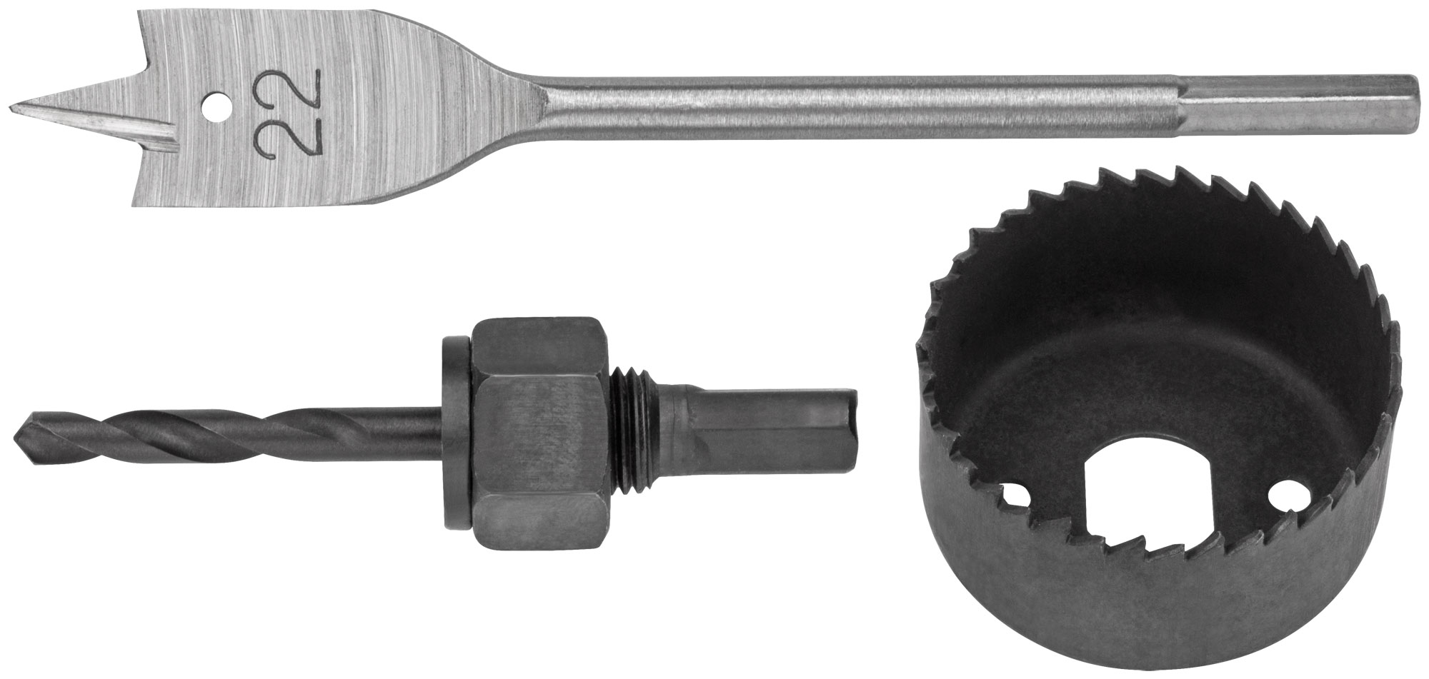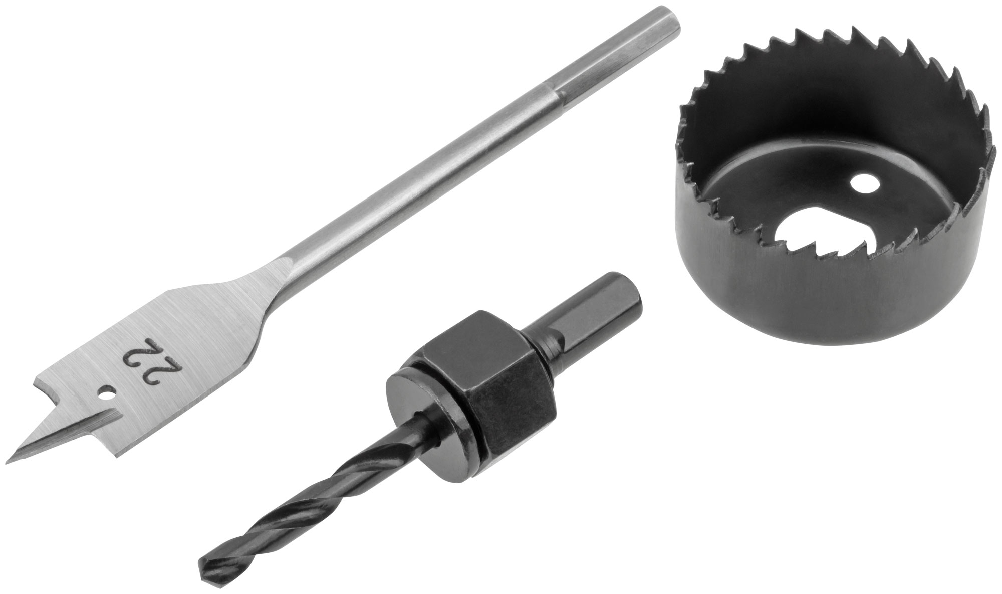 Набор из 3-х предметов. Сверло перовое D=22 мм, сверло направляющее D=6 мм, коронка кольцевая. Материал: инструментальная сталь. Упаковка: блистер.