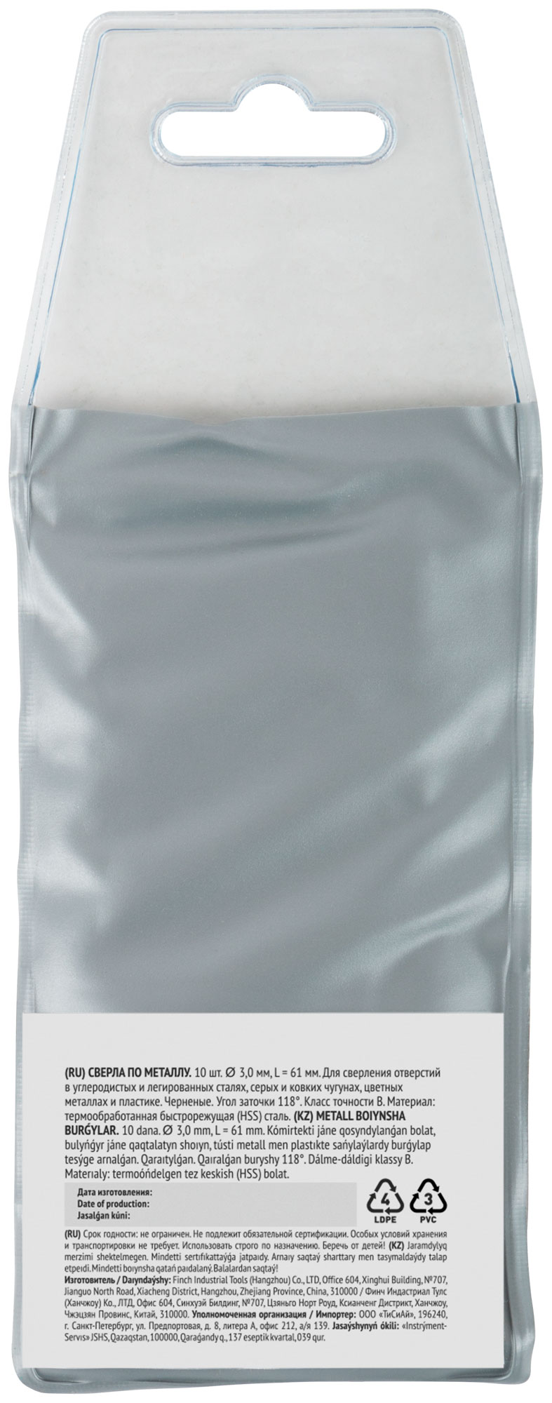 Цилиндрический хвостовик. Угол заточки 118°. Материал: быстрорежущая (HSS) сталь, винтовой прокат, черненое покрытие. Упаковка п/э конверт.