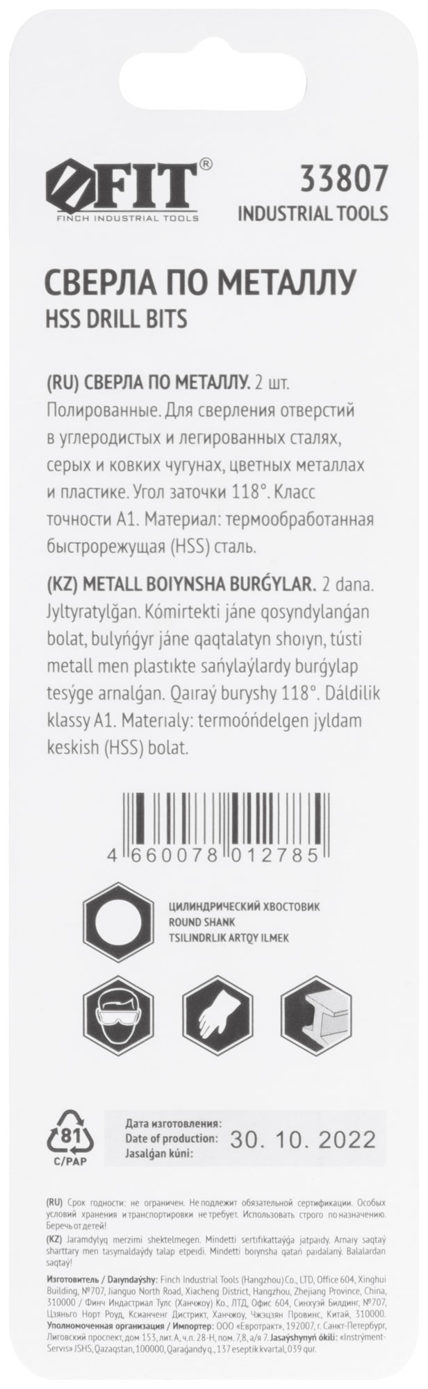 DIN 338. Цилиндрический хвостовик. Полированное. Угол заточки 118°. Класс точности А1. Материал: быстрорежущая (HSS) сталь. Упаковка: блистер.