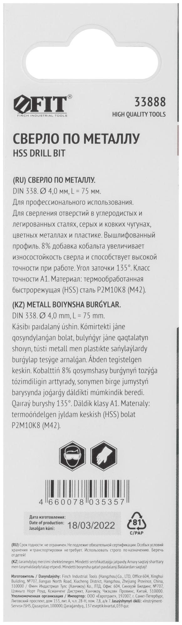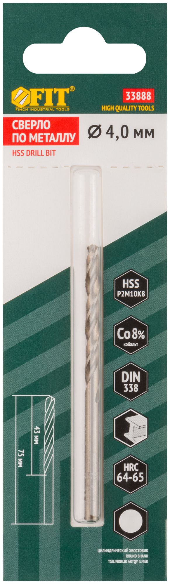Сверла по металлу HSS с добавкой кобальта 8% Профи ( М42 ) в блистере 4,0х75 мм ( 1 шт.)
