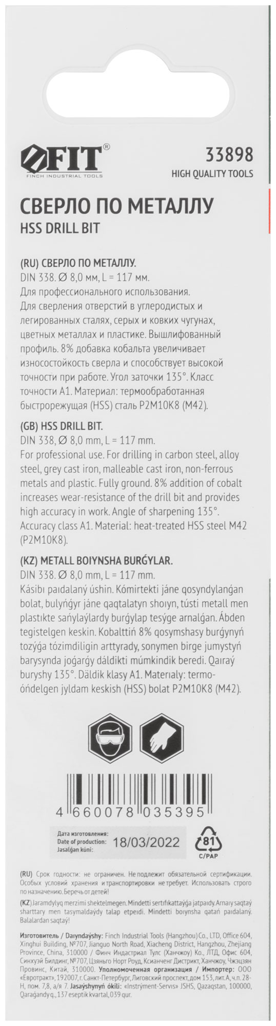 Профи. DIN 338. 8% добавка кобальта увеличивает износостойкость сверла и способствует высокой точности при работе. Для профессионального использования. Класс точности А1. Угол заточки 135°. Цилиндрический хвостовик. Вышлифованный профиль. Материал: быстрорежущая (HSS) сталь Р2М10К8 (М42). Упаковка: блистер.