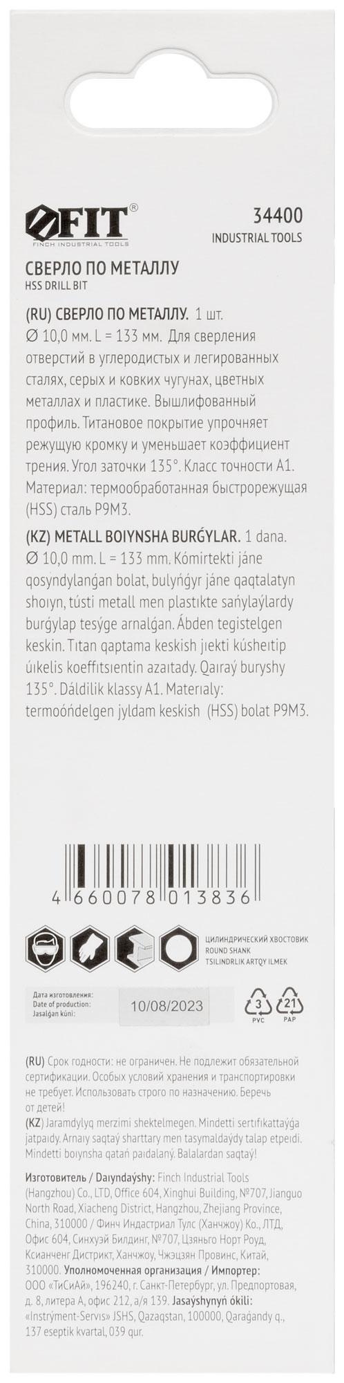 Цилиндрический хвостовик. Класс точности А1. Угол заточки 135 градусов. Вышлифованный профиль. Материал: быстрорежущая (HSS) сталь Р9М3 c титановым покрытием. Упаковка: блистер.