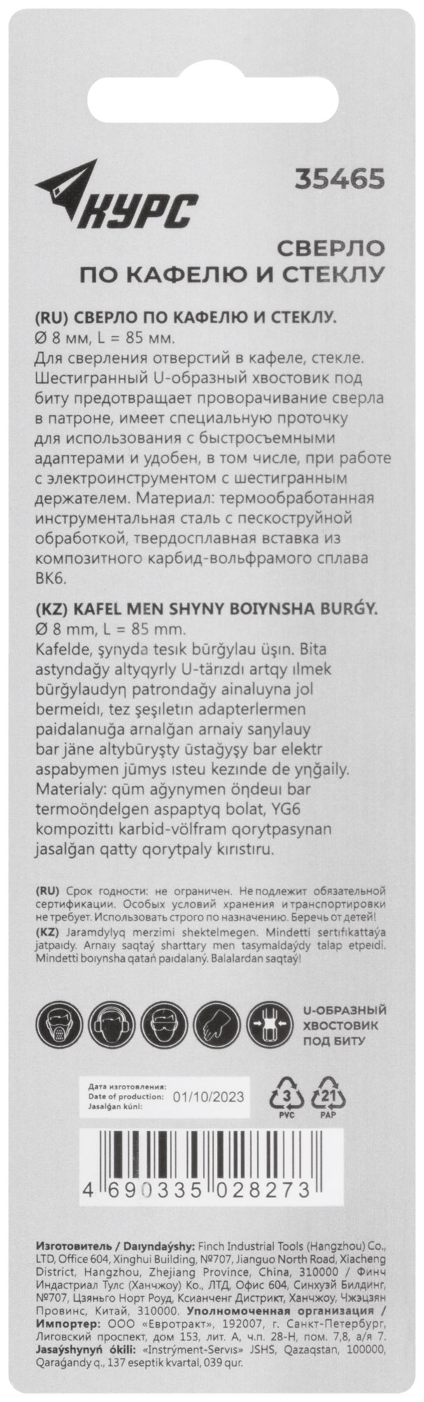 Сверло по кафелю и стеклу, шестигранный U-хвостовик под биту 8х85 мм