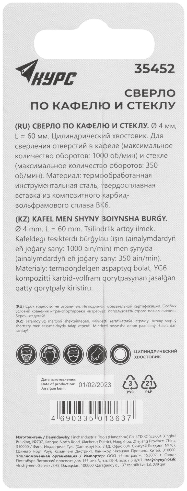 Цилиндрический хвостовик. Для сверления отверстий в стекле, кафельной плитке. Материал: инструментальная сталь, твердосплавная вставка. Упаковка: блистер.